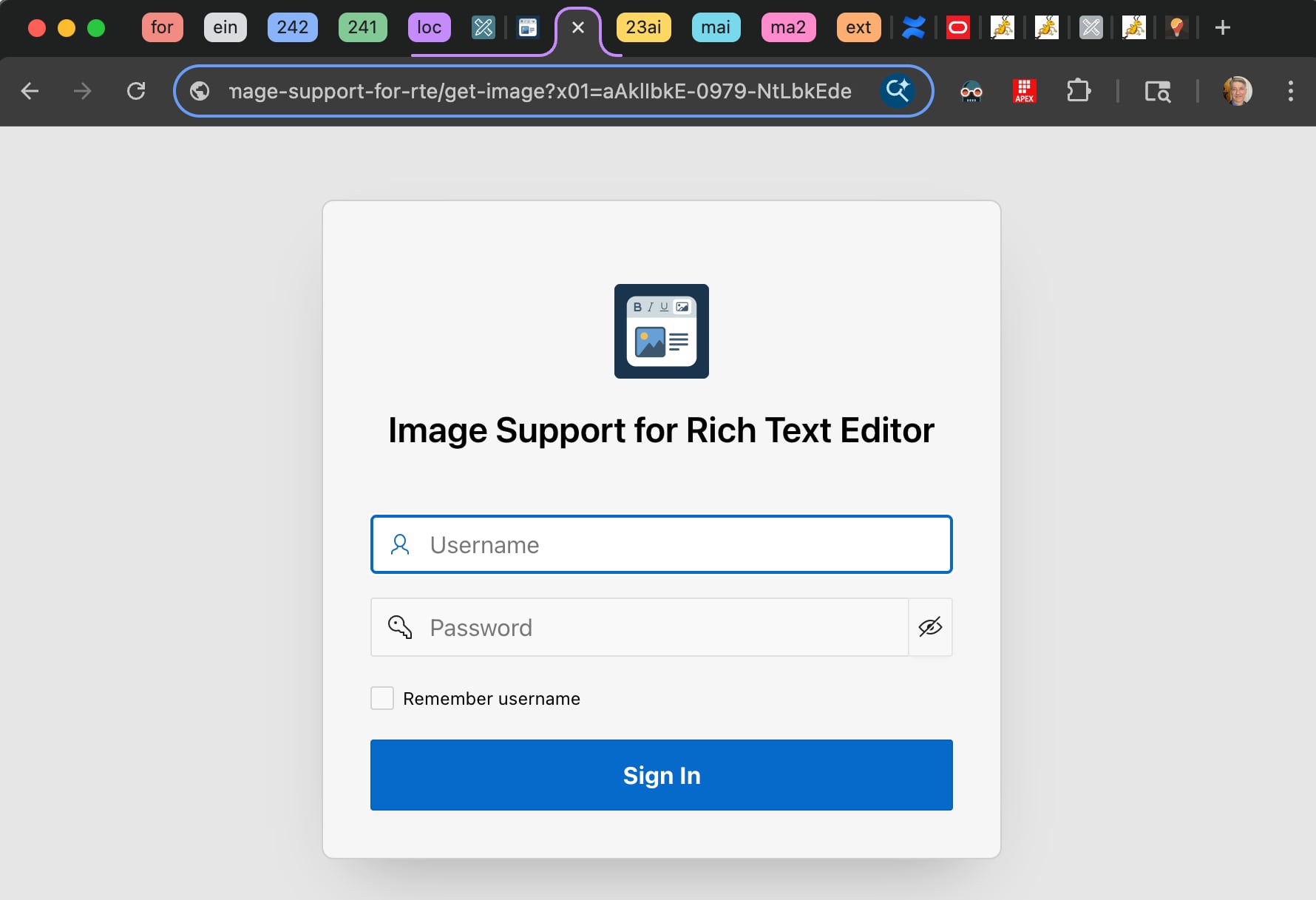 A clever corollary of using an APEX page to serve the image is authenticated access. In fact, if you repeat the experiment above but remove the session= parameter from the URL, then as shown below, the user sees the login page. An unauthenticated user can’t view the images.