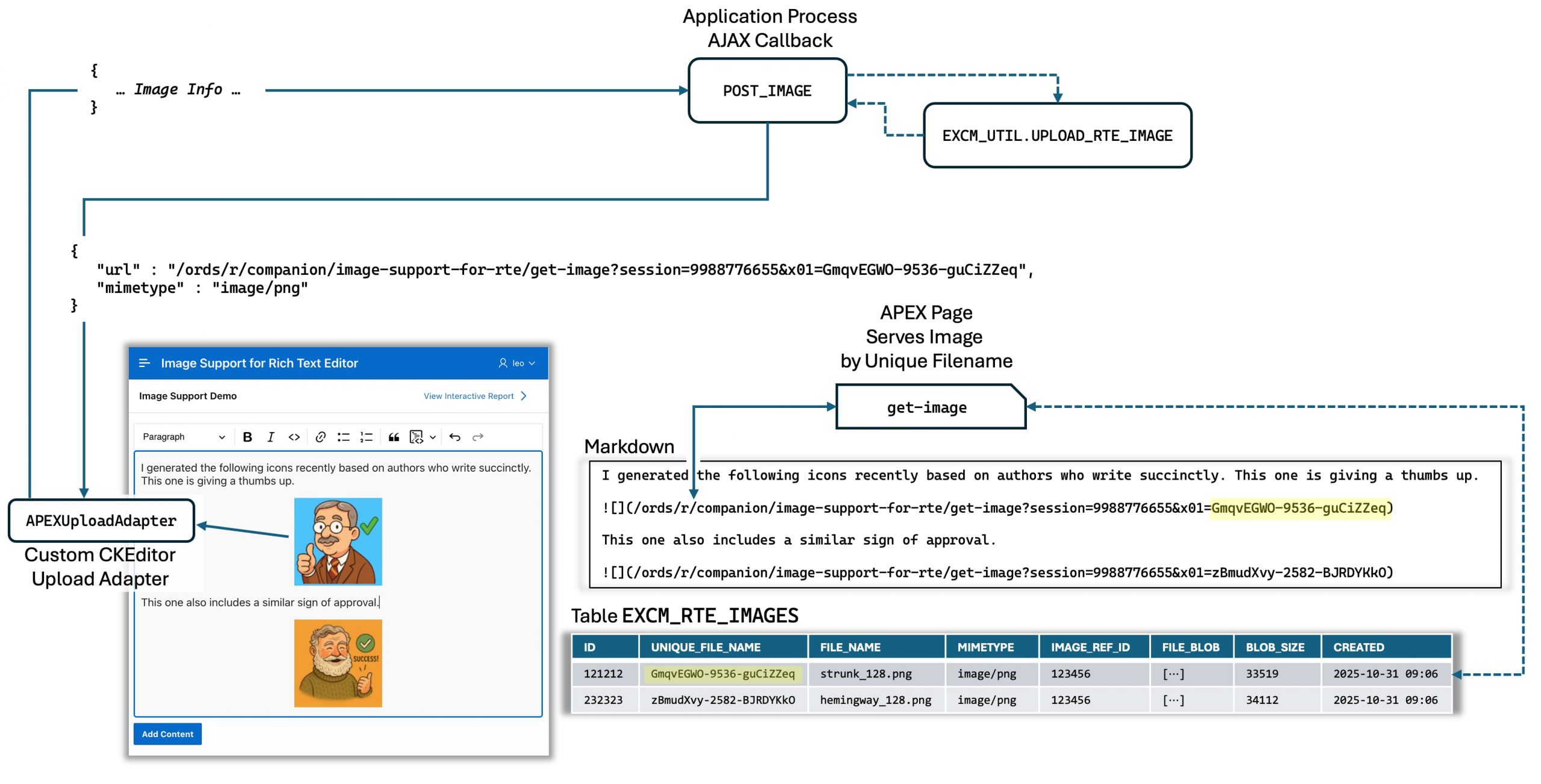 The architecture relies on a pseudo-foreign-key system that uses randomly generated image reference IDs to group and manage image lifecycles. When a page opens for new content, the hidden item Px_IMAGE_REF_ID gets a unique value from Oracle’s SYS_GUID() function. This ID tags all images uploaded in that editing session. As users drag images into the Rich Text Editor, a custom JavaScript upload adapter converts each to Base64 and sends it to the APEX process POST_IMAG. That process calls EXCM_UTIL.UPLOAD_RTE_IMAGE which decodes the Base64 data, stores it as a BLOB in EXCM_RTE_IMAGES tagged with the current IMAGE_REF_ID, and returns a URL for a dedicated image-serving page. CKEditor then displays the image inline, letting users see it immediately while they continue composing.