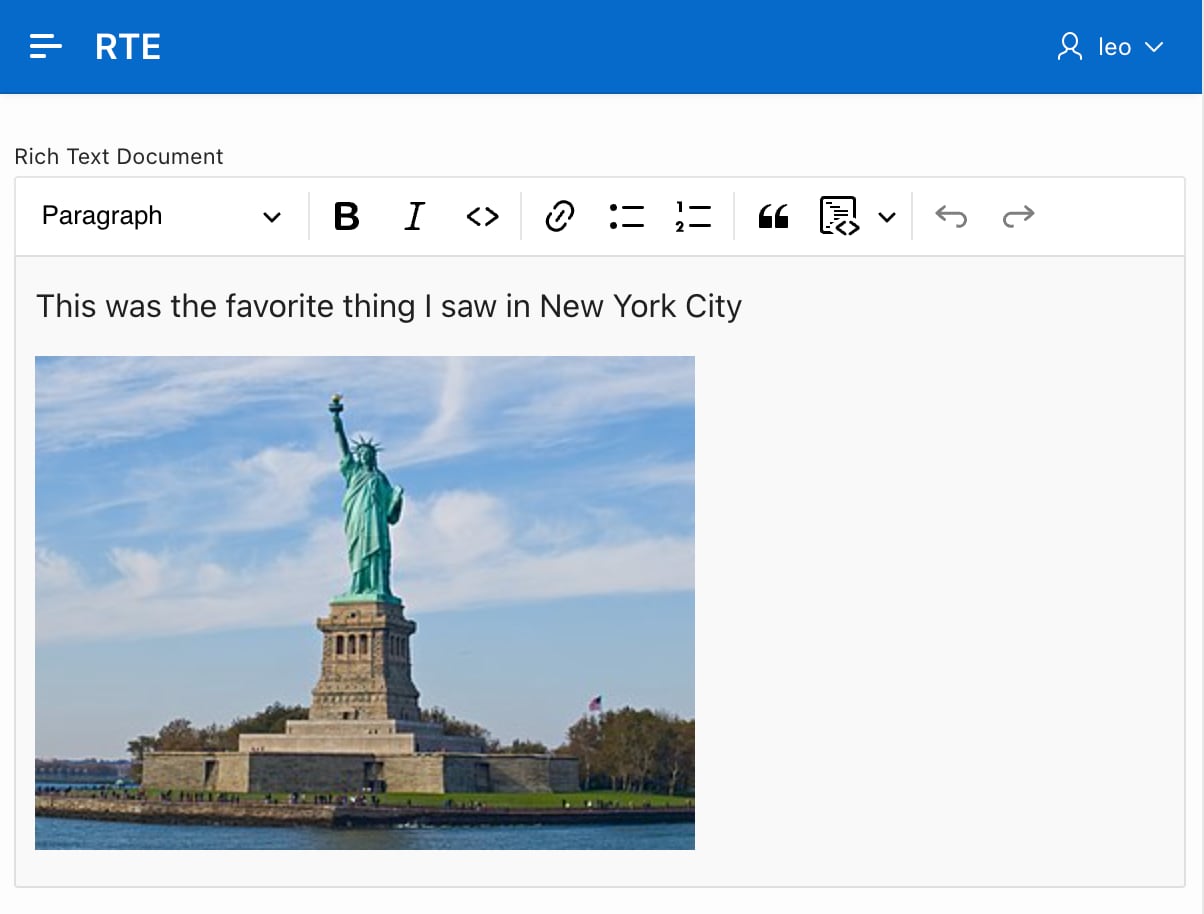 The upload adapter then embeds the added image URL in the document. The Rich Text Editor immediately uses this image URL to retrieve the image to display to the user.