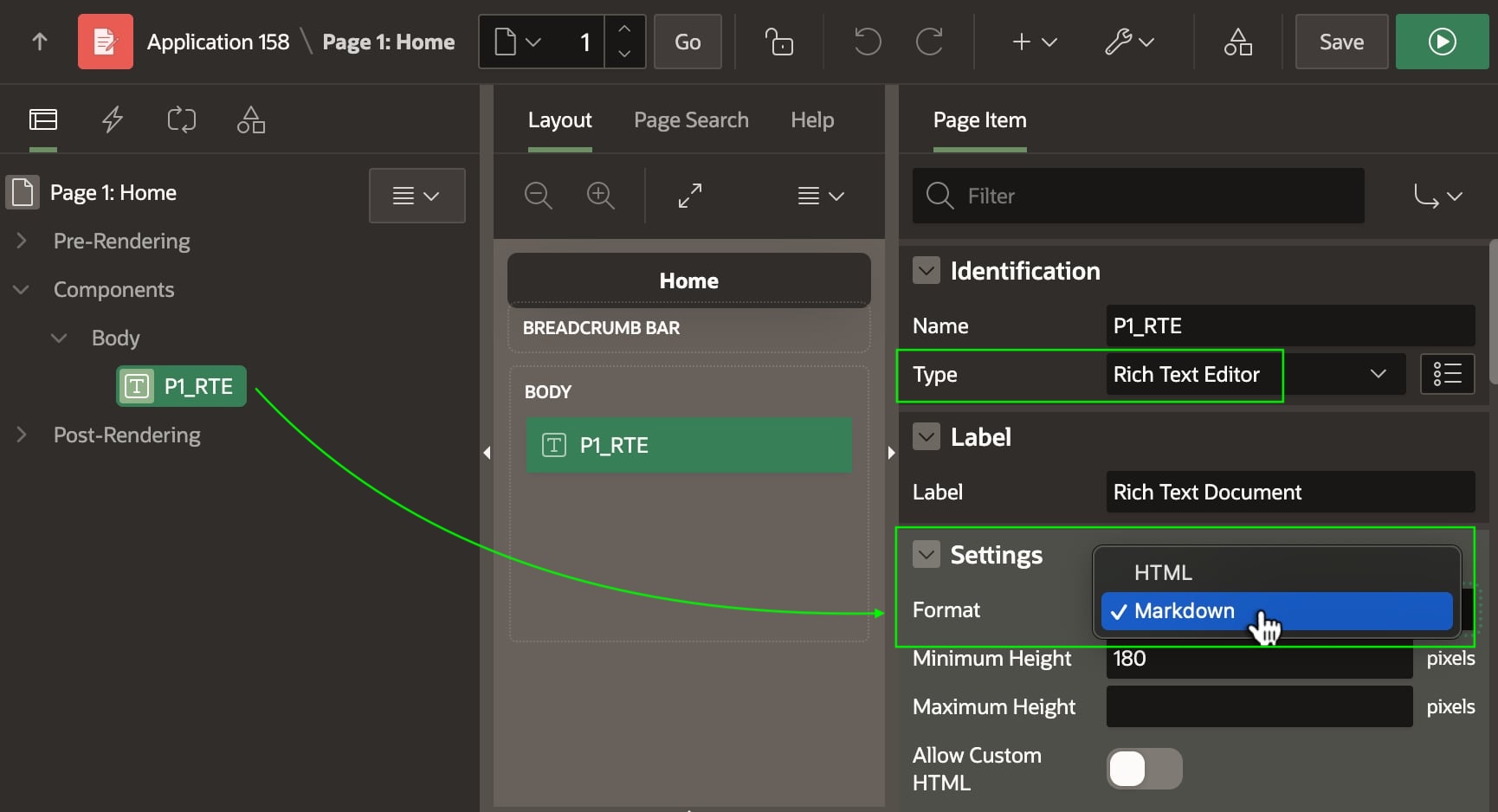 You configure each Rich Text Editor page item to store the document as HTML or the Markdown format.