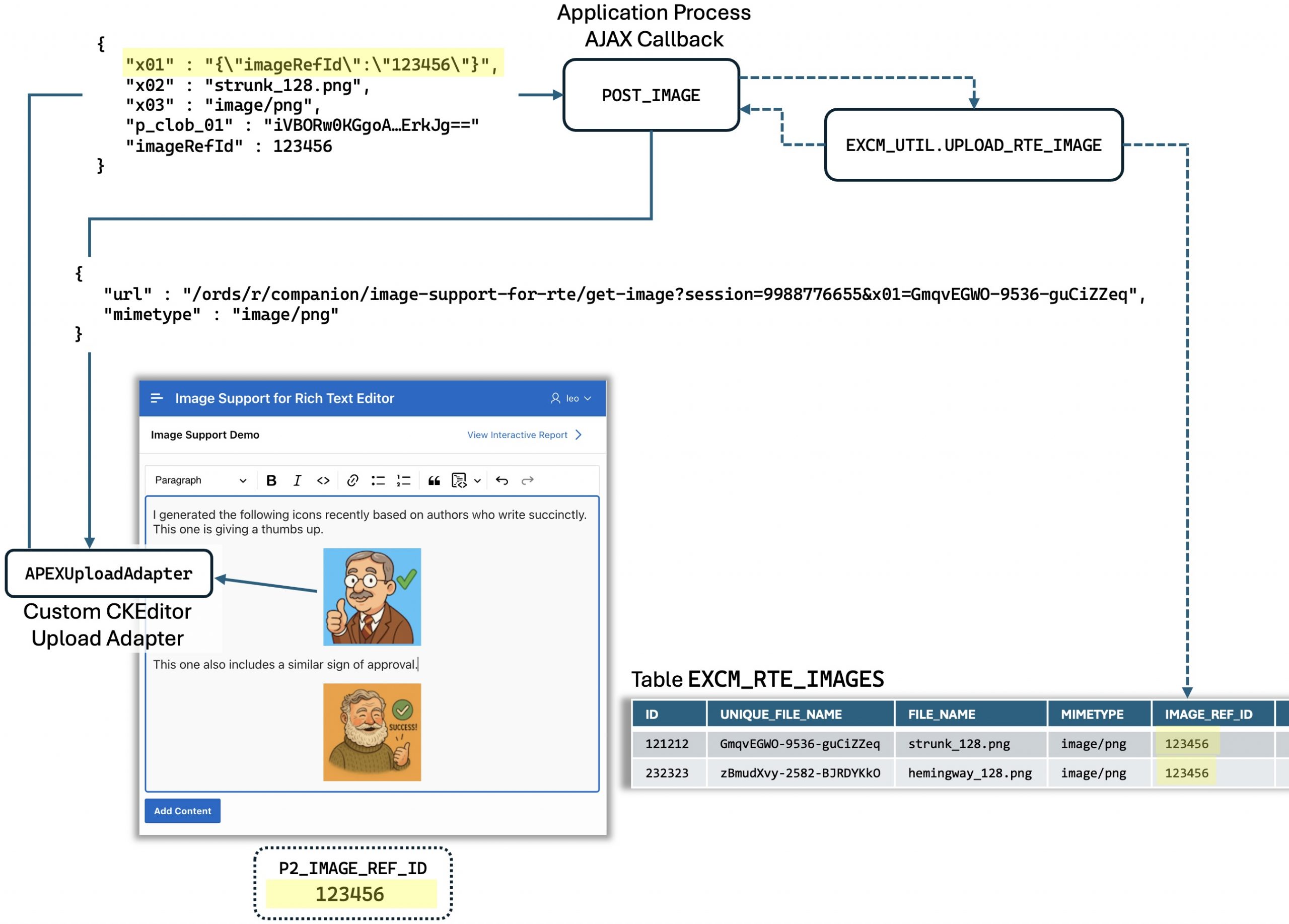 The APEXUploadAdapter passes this value in the x01 parameter as a small JSON document with the key imageRefId, and then the UPLOAD_RTE_IMAGE procedure called by the POST_IMAGE application process AJAX callback inserts that value into the IMAGE_REF_ID foreign key column when it inserts the image into the EXCM_RTE_IMAGES table. It creates a JSON response payload that includes the new URL containing the image’s unique filename.