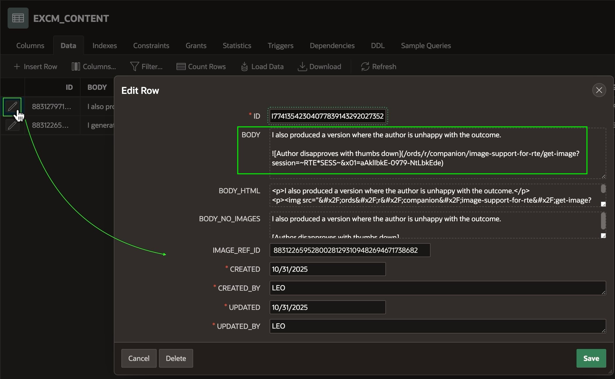 Exploring the contents of the EXCM_CONTENT table in the Object Browser after performing the steps above, we see that user LEO inserted two comment rows. Clicking the pencil icon as shown below to browse the details of the most recently added comment, we see its BODY column contains the Markdown syntax for the rich text document containing a single image with alternative text.