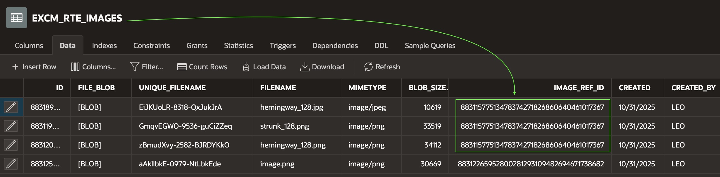 Studying the contents of the EXCM_RTE_IMAGES table in the Object Browser, we see that a total of four user-added images were uploaded and stored in the table. As shown by the highlighted rectangle, three of them share one IMAGE_REF_ID value, while the fourth one has a distinct value for IMAGE_REF_ID.
