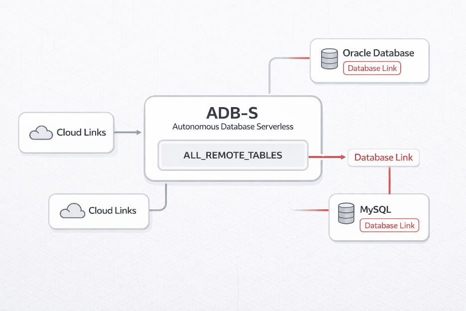 This is where ALL_REMOTE_TABLES helps. Oracle Autonomous Database Serverless introduces this new dictionary view to give users a centralized way to discover remote tables they can access through Database Links (Oracle and non-Oracle systems) and Cloud Links. Instead of hunting across multiple remote connections, users can query a single view and quickly understand what remote data is available to them.
