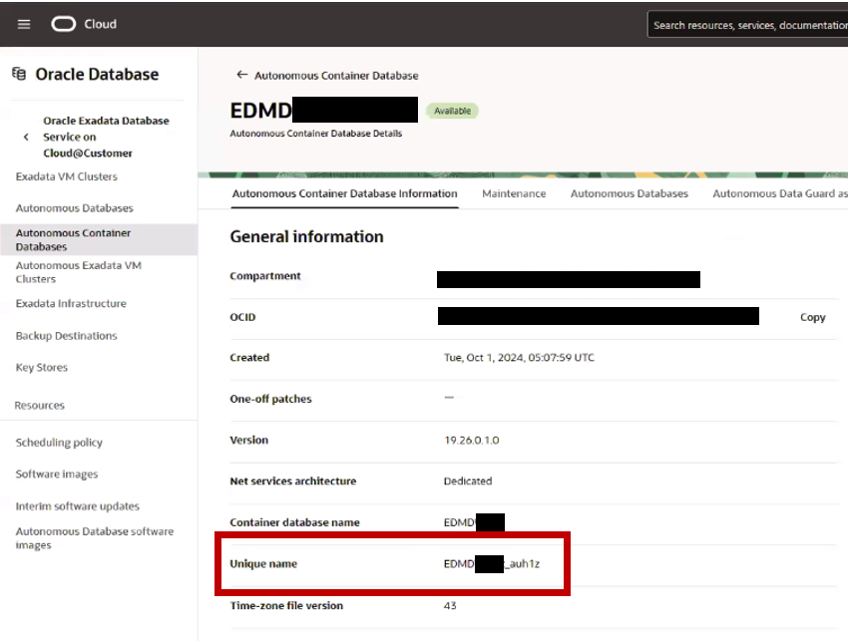 Both, VPC user and backup policy, should be provided by the ZDLRA administrator. - For the next steps, we need to know the DB_UNIQUE_NAME parameter of the database we want to register. This item can be found in the ACD main page: