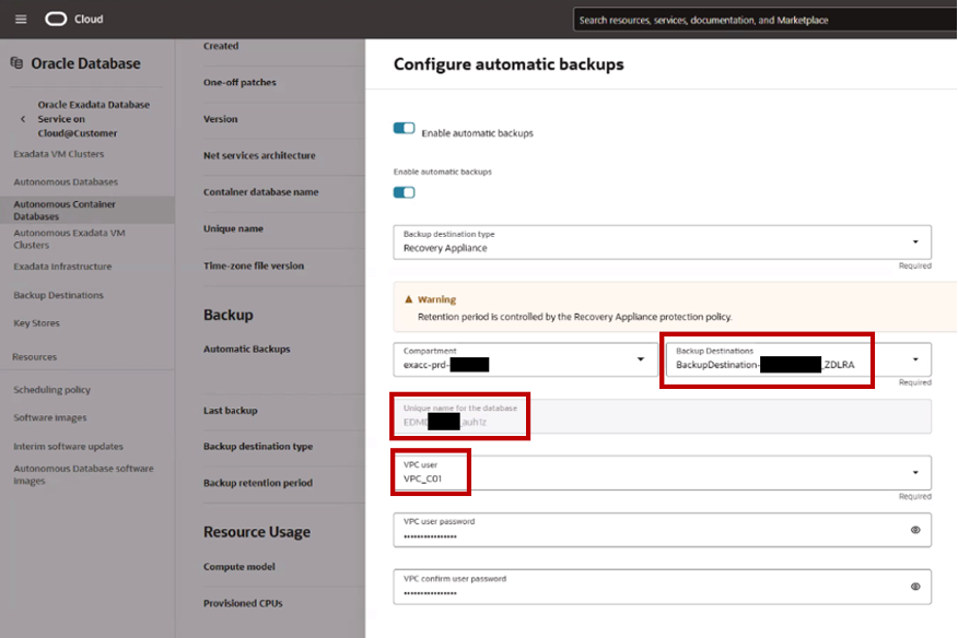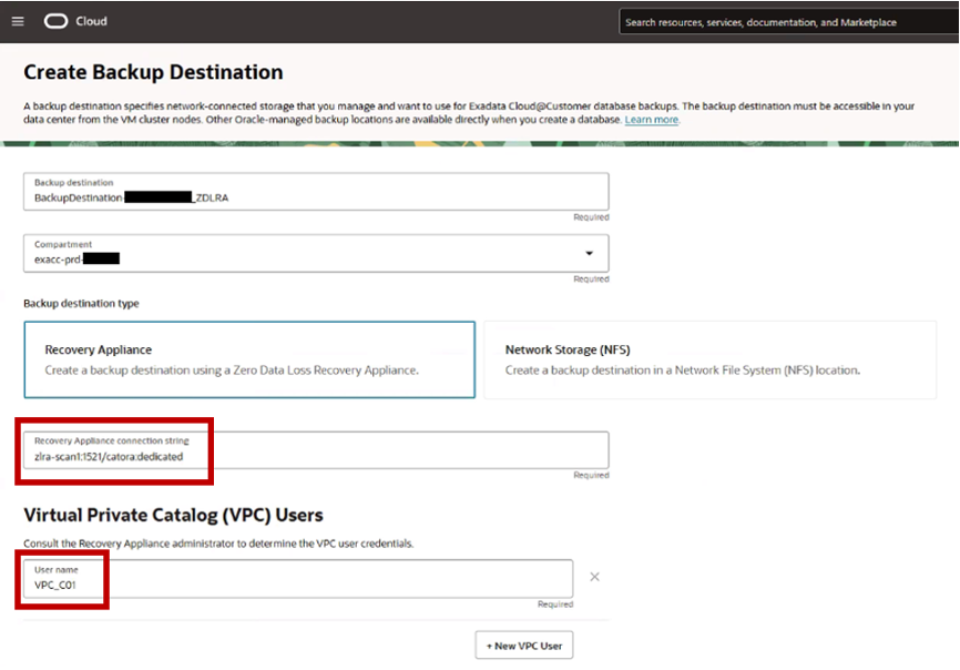 Create the backup destination in the right compartment using “Recovery Appliance” as type. The connection string used for the backup destination recovery configuration follows the format <zdlra_host>:<port>/<zdlra_servicename>:dedicated and the VPC user is the one previously created.