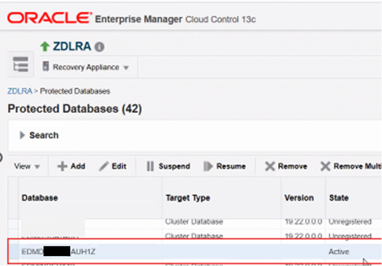 - If the previous step finishes successfully the ACD will change its status in the RA catalog from unregistered to ACTIVE in the RA_DATABASE view. This can also be checked from OEM accessing to the protected databases view from the ZDLRA management page, but it will take some time to be refreshed and appear there.