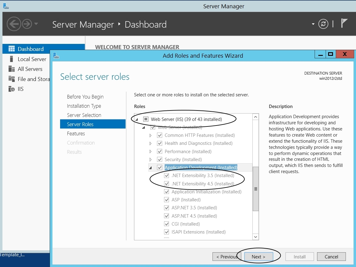 NOTE: It is important to enable “.NET Extensibility 3.5” and “.NET Extensibility 4.5” and all other roles under Web Server IIS.