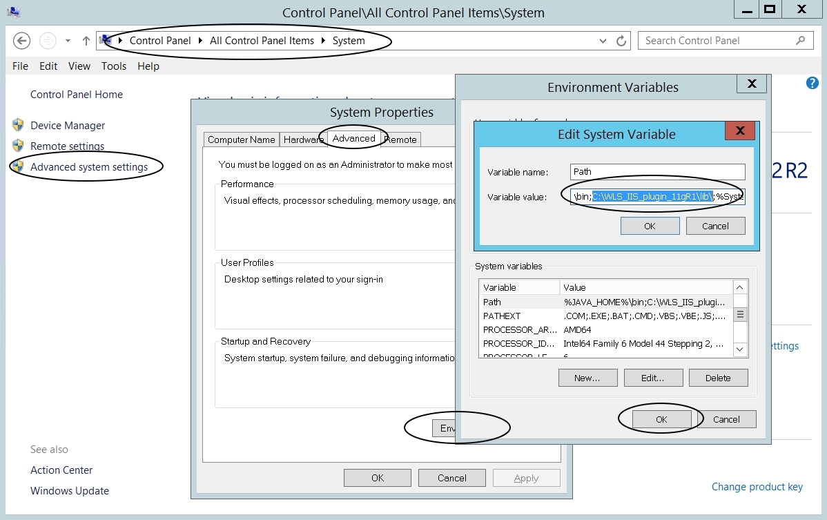 NOTE: Make sure you add it at the start of the Path variables. (Example: %JAVA_HOME%\bin;C:\WLS_IIS_plugin_11gR1\lib\;%SystemRoot%\system32;… and so on)