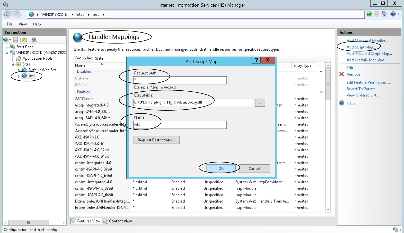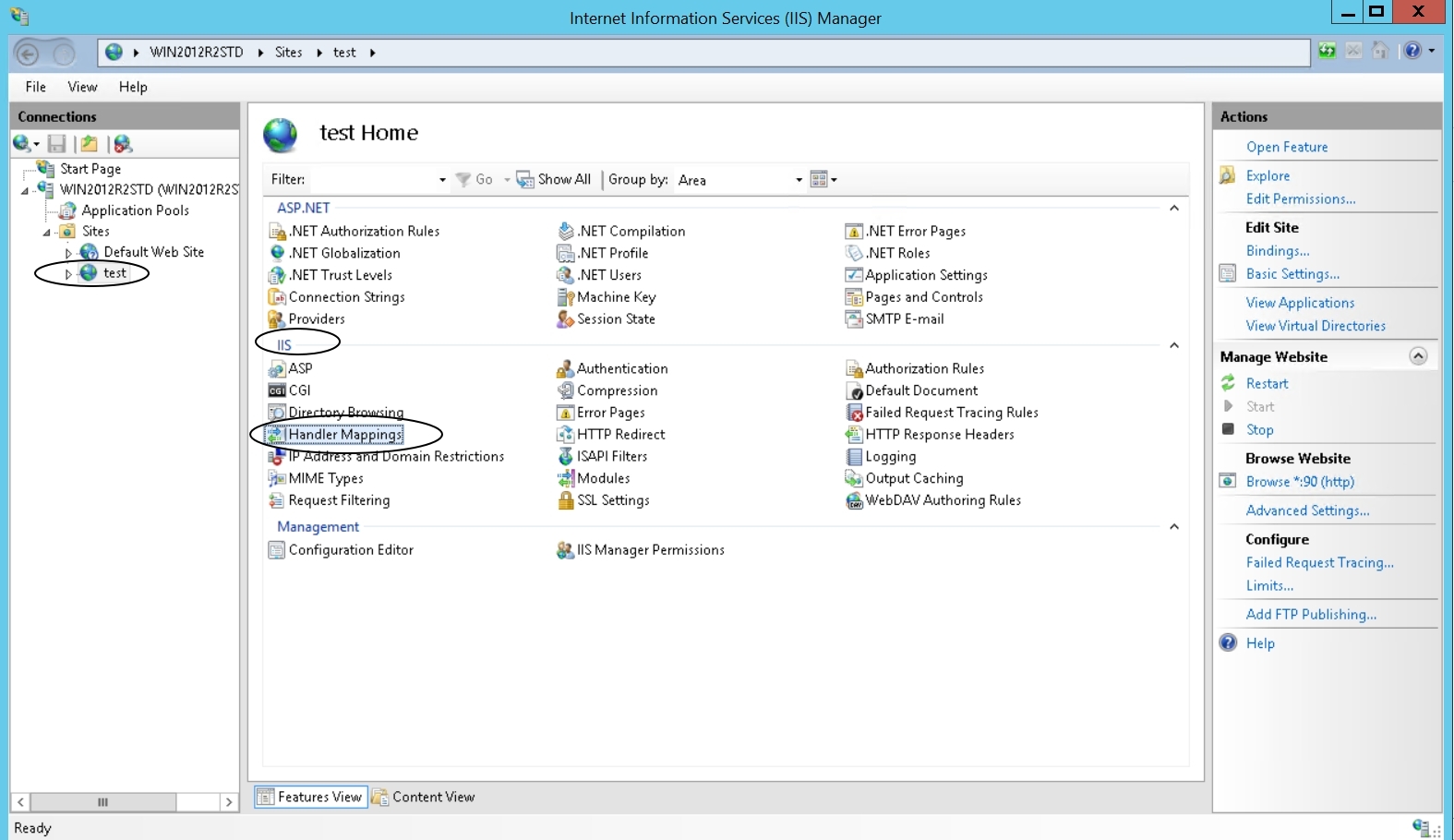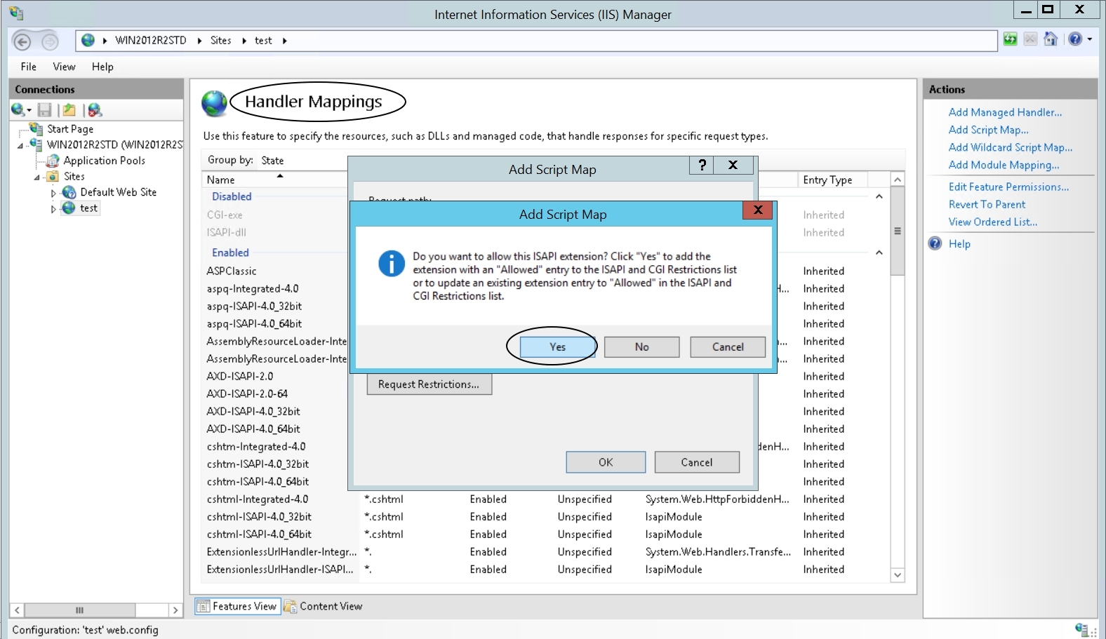 Under “Handler Mapping” -> “Actions” -> select “Add Script Map” and enter the following details :
