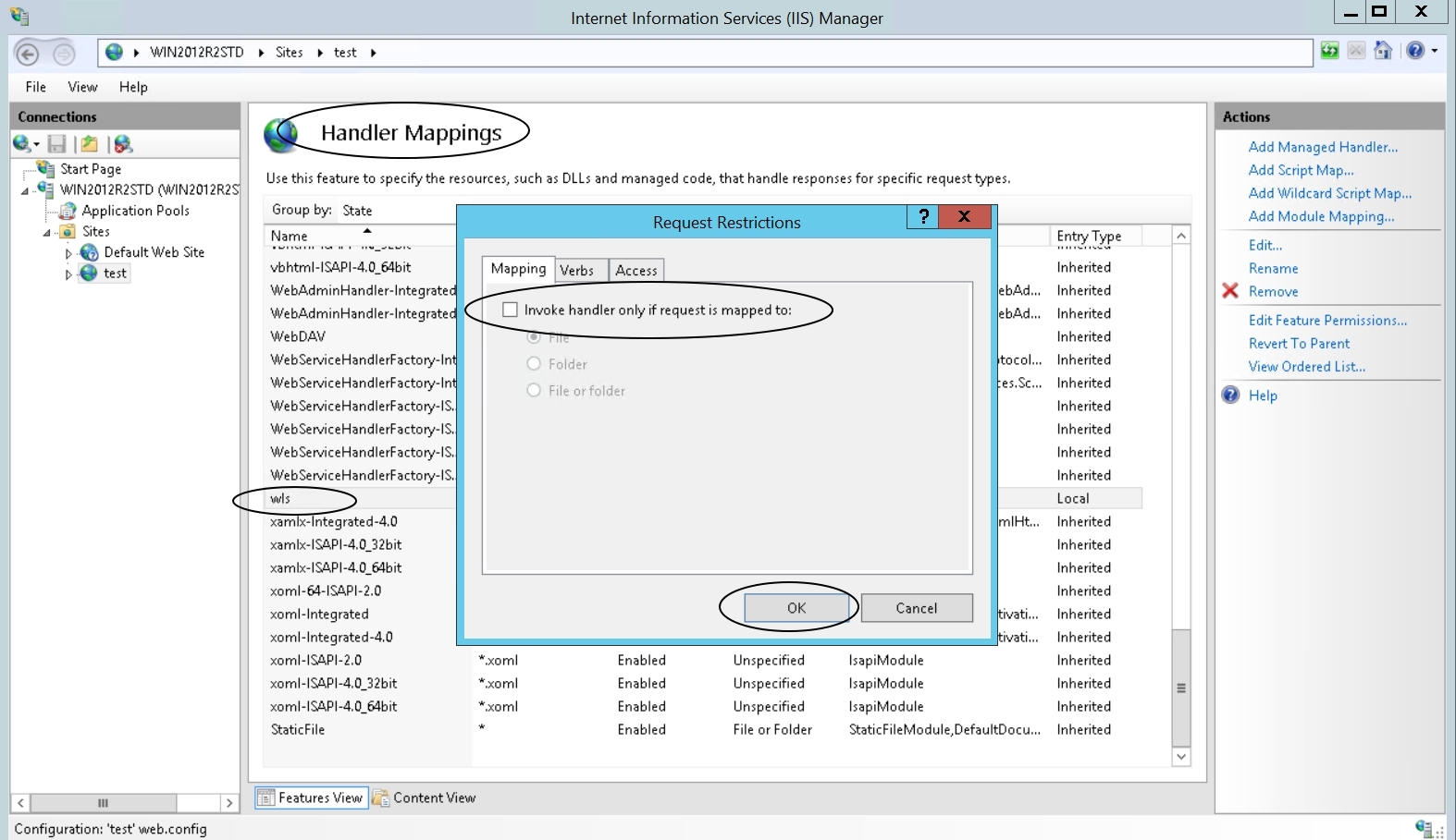 Click on “Request Restrictions” and uncheck “Invoke handler only if the request is mapped to”: