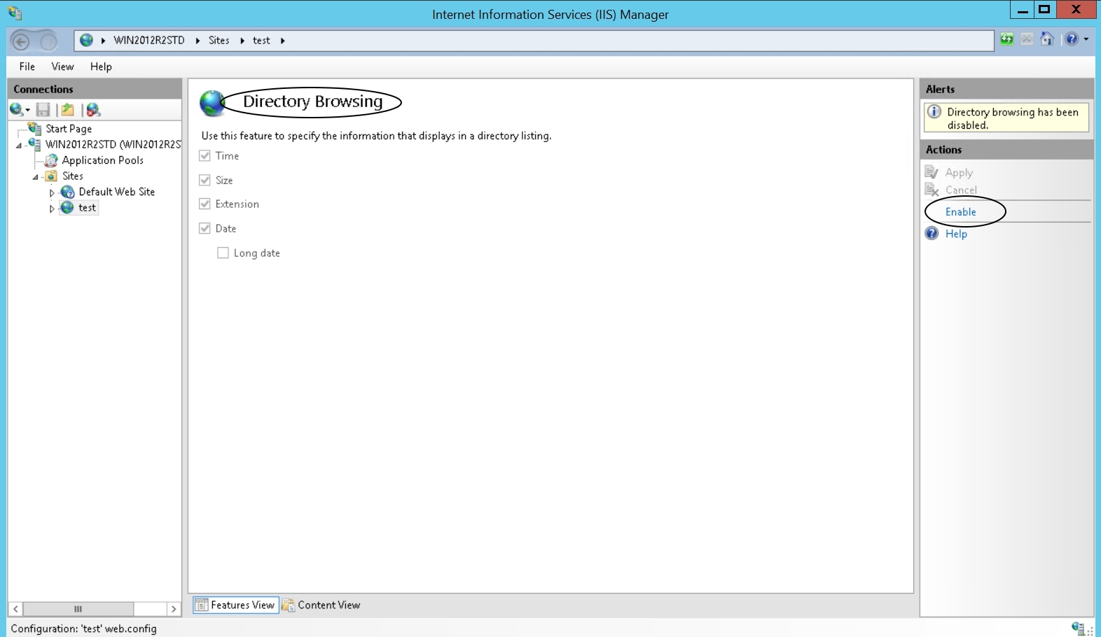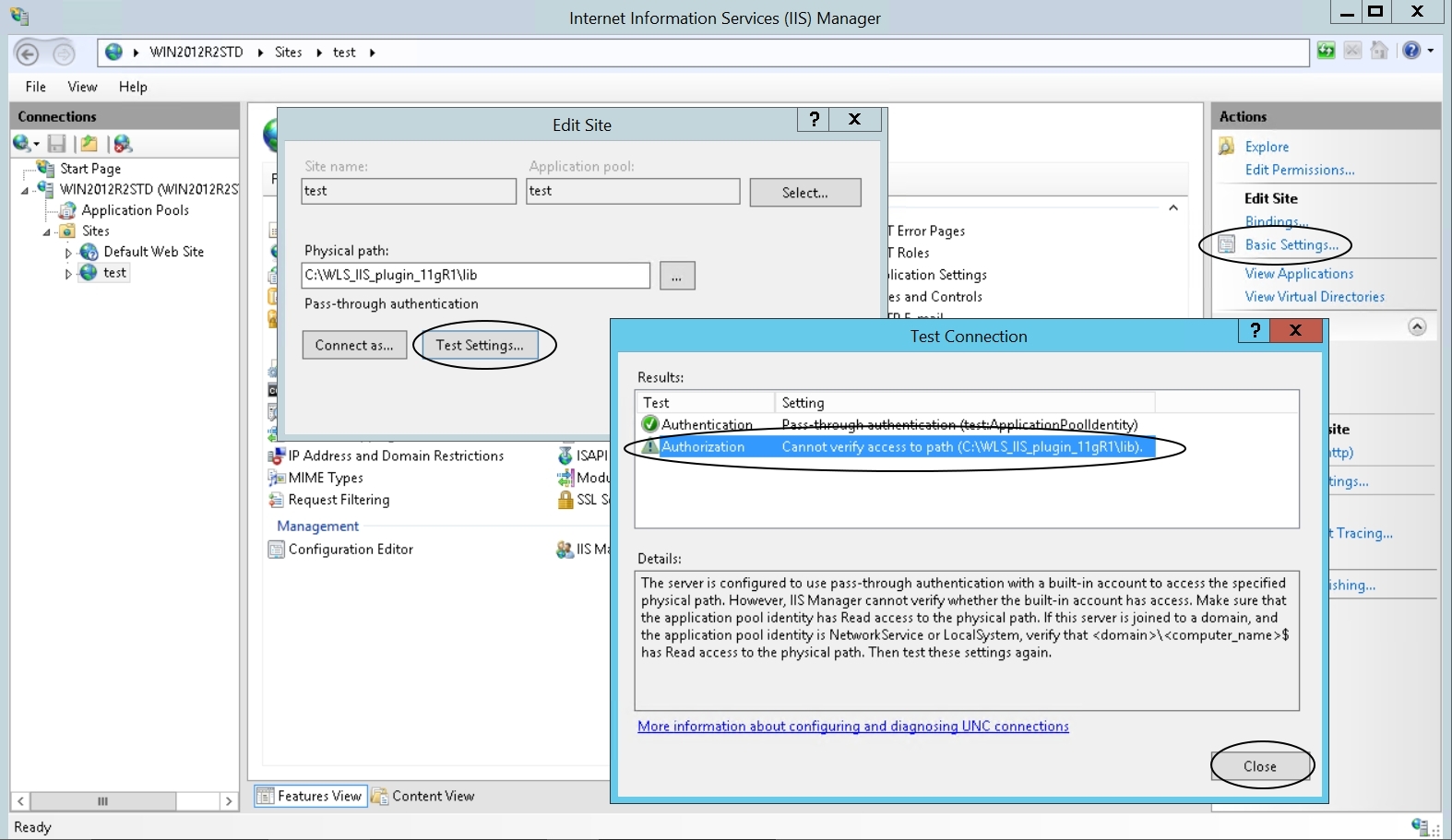 “The server is configured to use pass-through authentication with a built-in account to access the specified physical path. However, IIS Manager cannot verify whether the built-in account has access. Make sure that the application pool identity has Read access to the physical path. If this server is joined to a domain, and the application pool identity is NetworkService or LocalSystem, verify that <domain>\<computer_name>$ has Read access to the physical path. Then test these settings again.”
