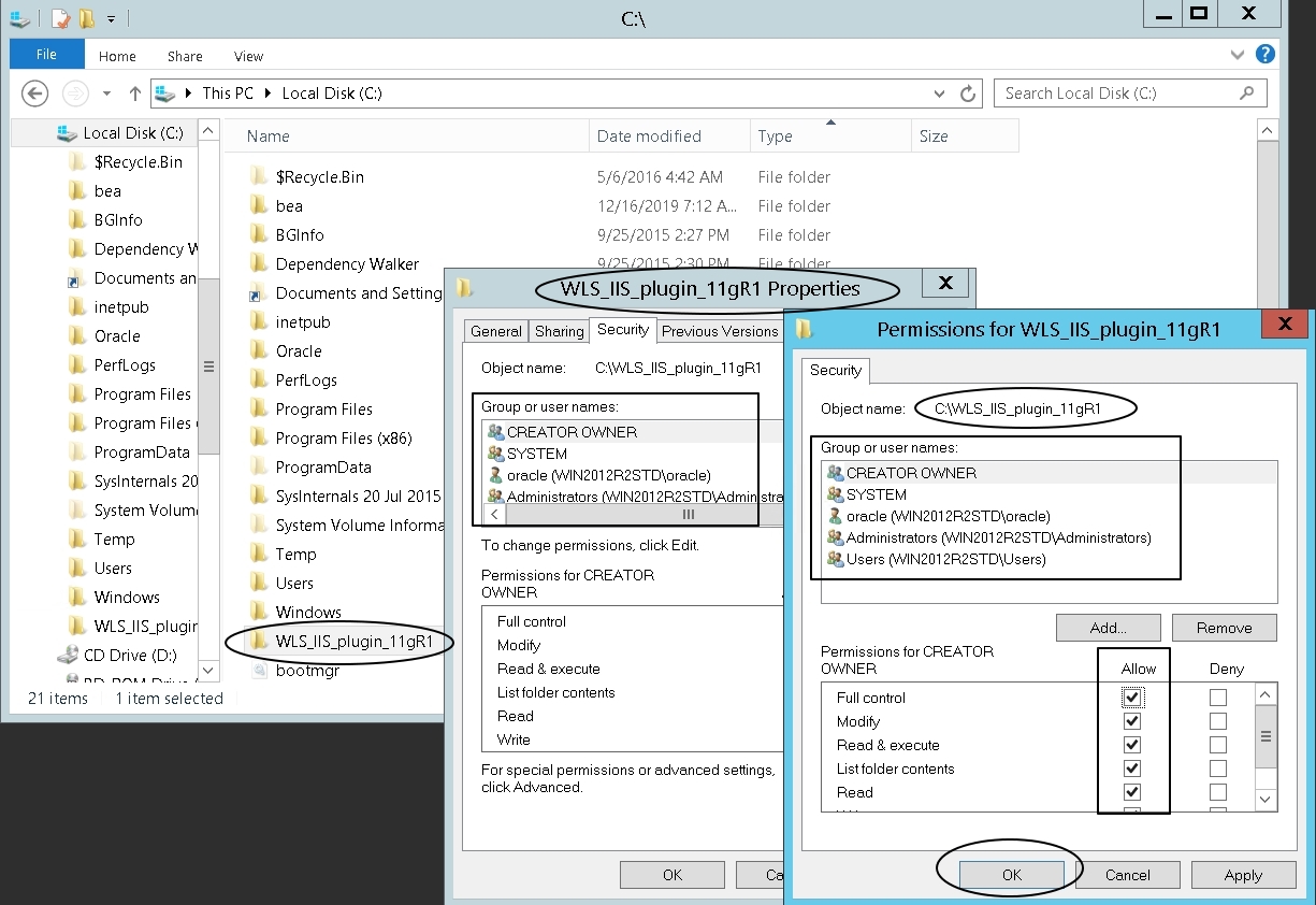 Edit the Permission for all users and “Allow” “Full control” for folder “C:\WLS_IIS_plugin_11gR1”