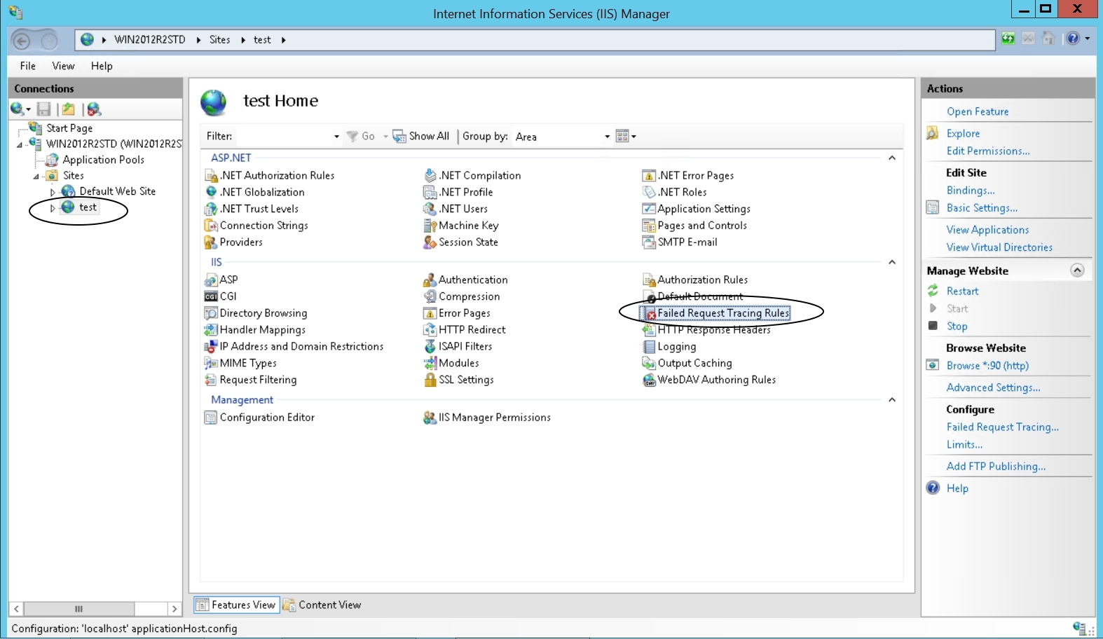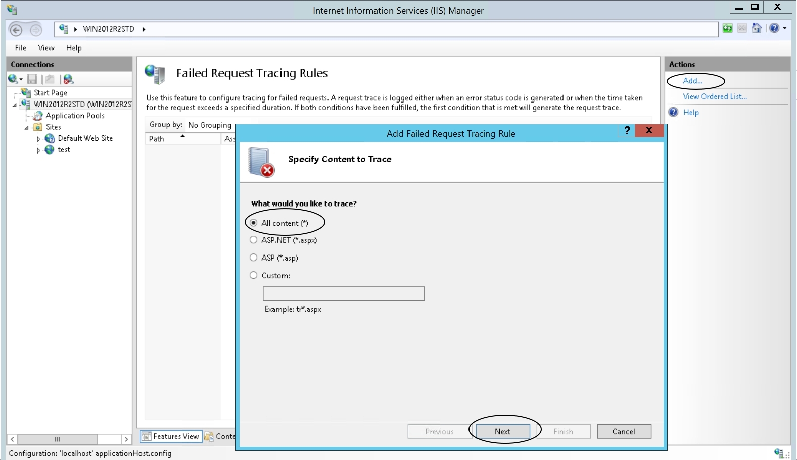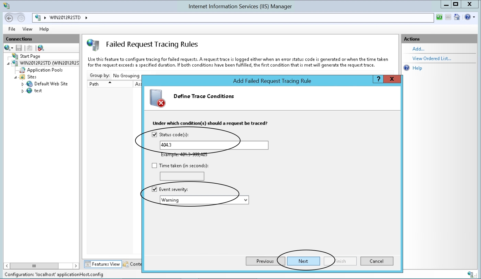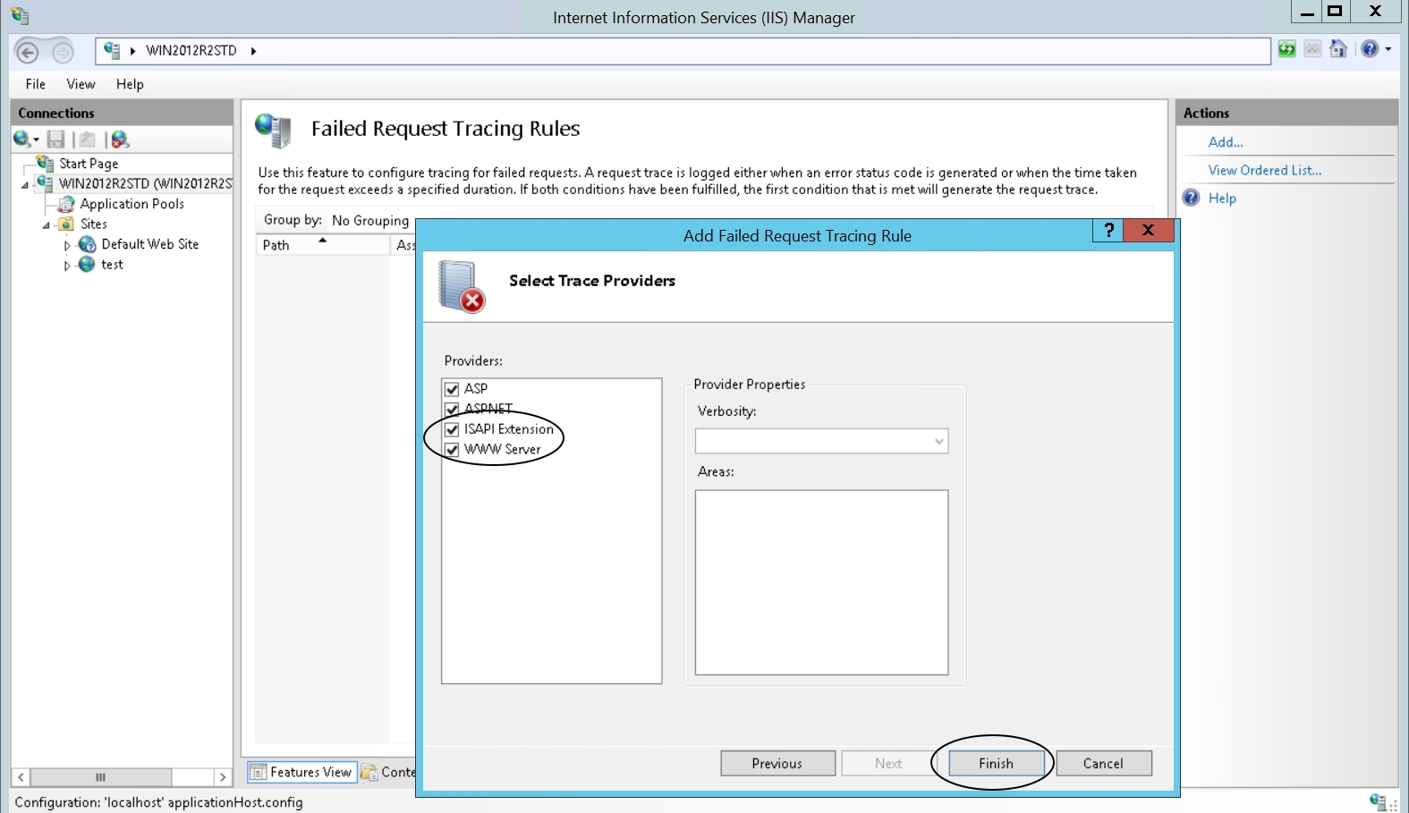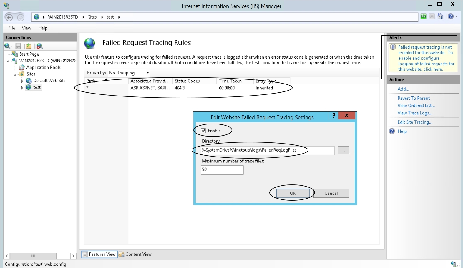 5) Set “Failed Request Tracing Rules” to get additional information in case of errors: