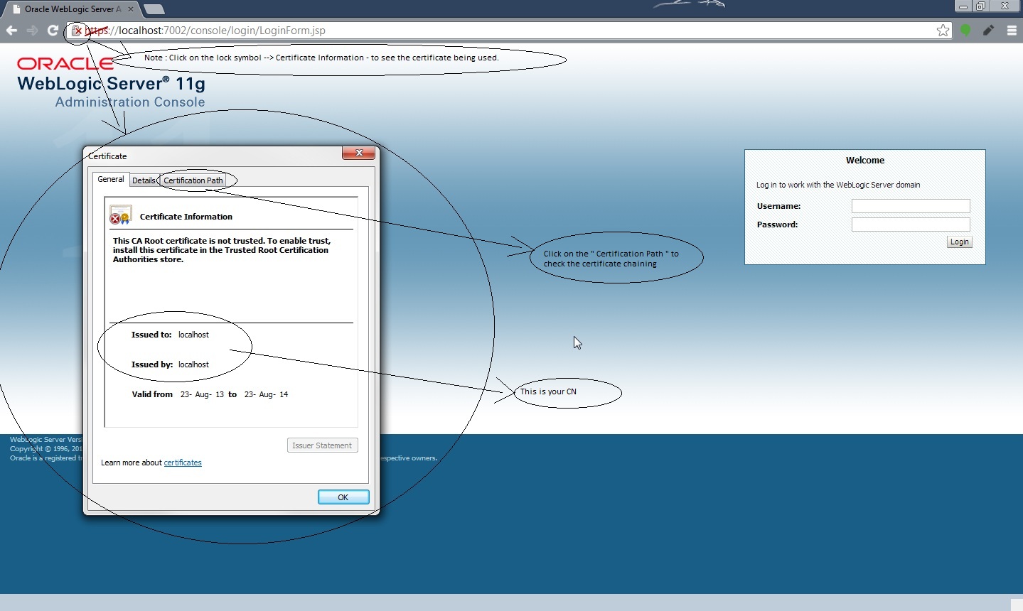 To get rid of the above warnings create a csr and get it signed from a third party CA like GoDaddy, Verisign, Thawte etc and configure Custom Identity and Custom Trust in Weblogic Server.