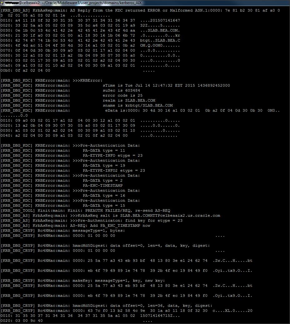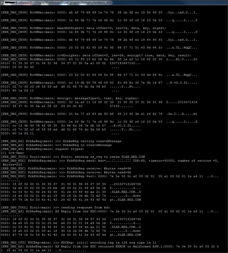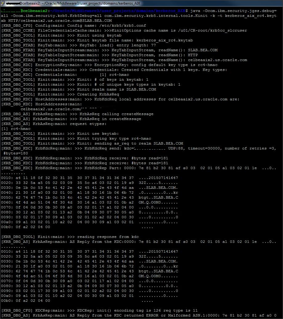 java -Dcom.ibm.security.jgss.debug=all -Dcom.ibm.security.krb5.Krb5Debug=all com.ibm.security.krb5.internal.tools.Kinit -k -t kerberos_aix_rc4.keytab HTTP/celbeaaix2.us.oracle.com@SLAB.BEA.COM