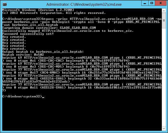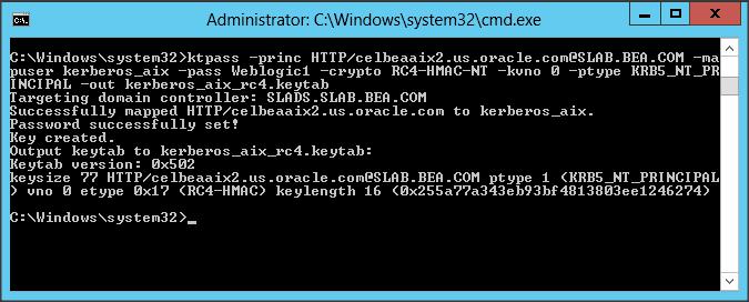 Command : ktpass -princ HTTP/SLKRBTRN6-03@SLKRBTRN6.BEA.COM -mapuser wlsclient -pass Weblogic1 -crypto Rc4-HMAC-NT -kvno 0 -ptype KRB5_NT_PRINCIPAL -out kerberos_aix_rc4.keytab