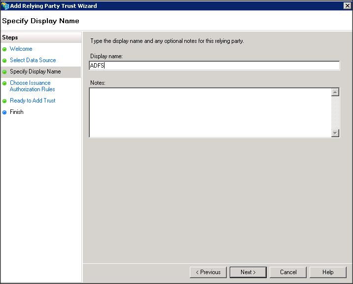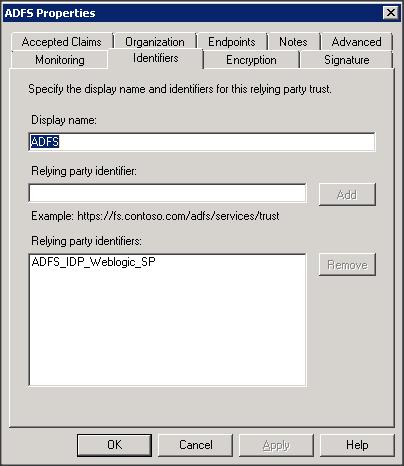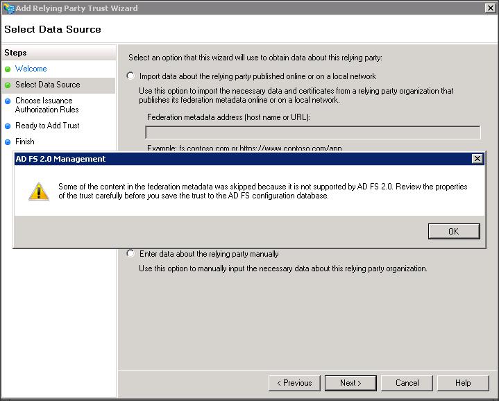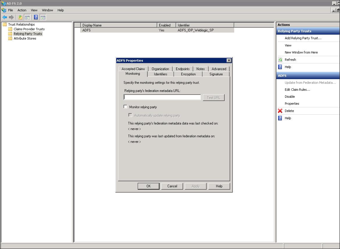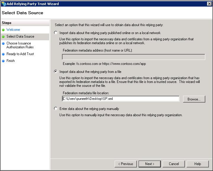 – Import the replying party data into ADFS IDP using the SP metadata file that you copied from WLS box (i.e sp.xml)