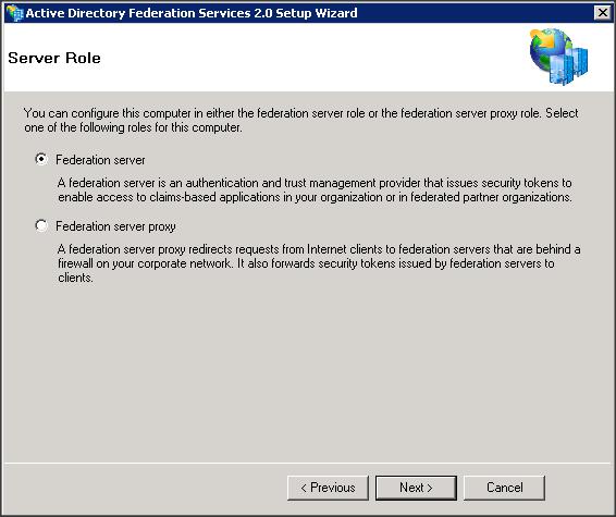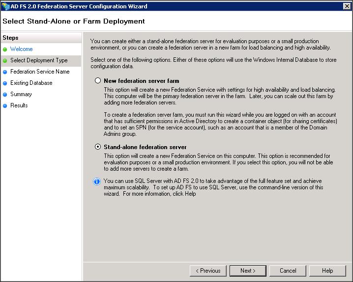 – Lets create a Stand-alone federation server for this example. If you want to use the high-availability / load balancing feature in ADFS then create a Federation server Farm.