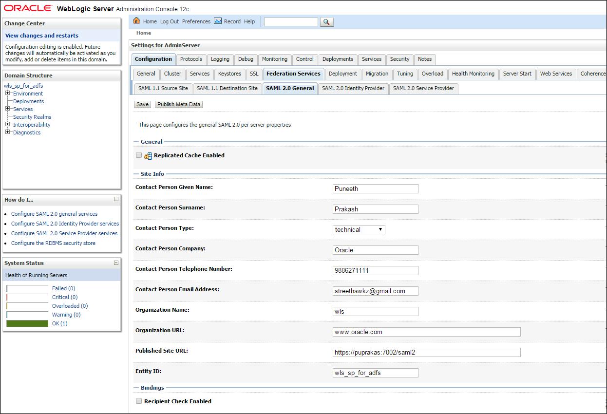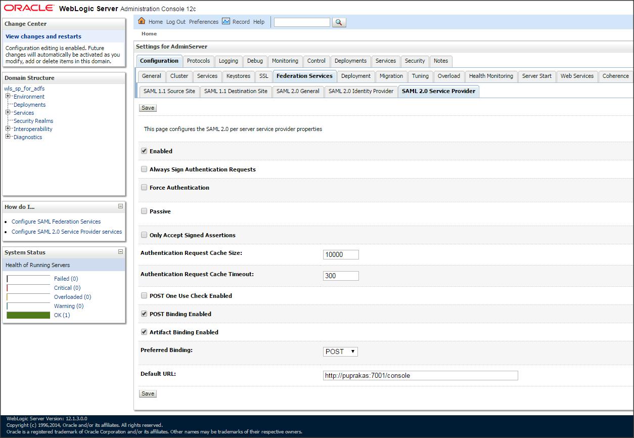 Now click on ” Servers ” –> Admin Server –> ” Federation Services ” –> ” SAML 2.0 General ” and make the following changes :