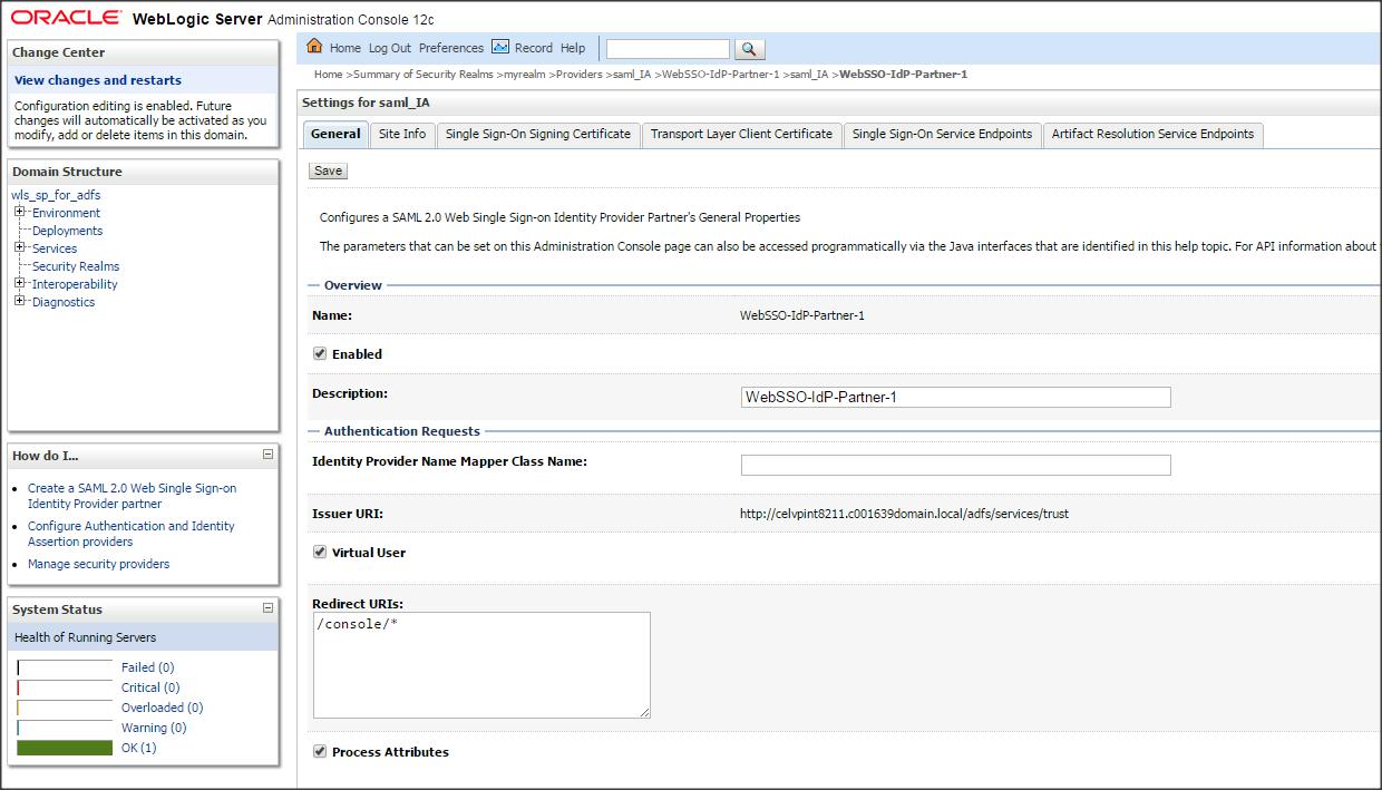 Click on ” Security Realms ” –> ” myrealm ” –> ” Providers ” –> Authentication -> saml_IA –> ” Management ” –> ” New ” –> “ New Web Single Sign-On Identity Provider Partner ” say ” WebSSO-IdP-Partner-1 ” and then select ” federationmetadata.xml ” :