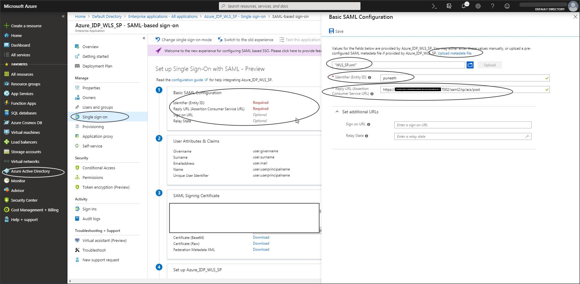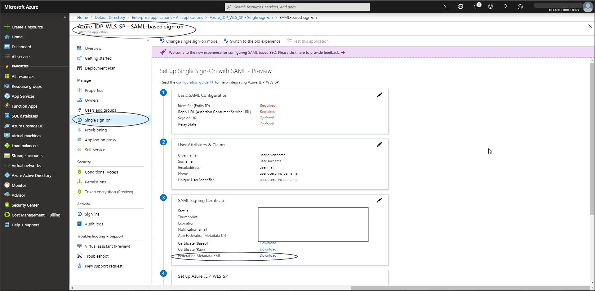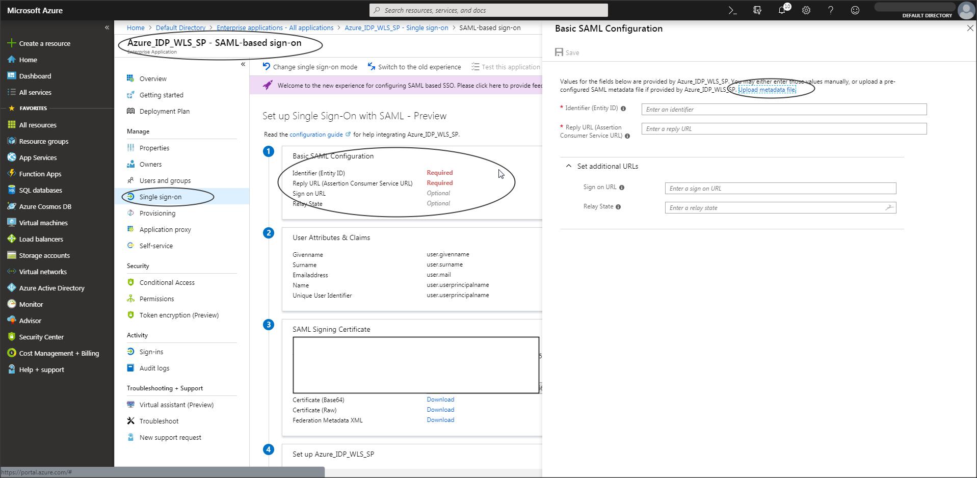 Click on “Upload Metadata File” in Azure console and upload the “WLS-SP-Metadata.xml” file -> You should now be able to download the Azure IDP metadata.