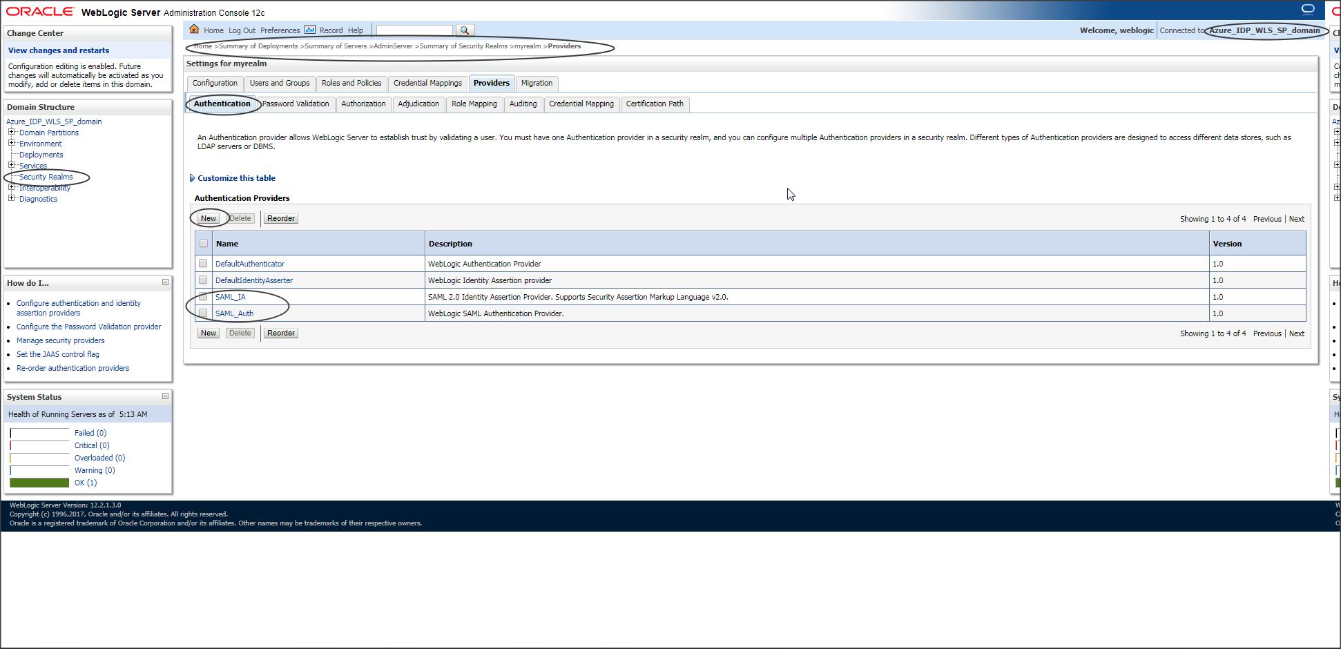 Create SAML Identity Provider and SAML Authentication provider in Weblogic.
