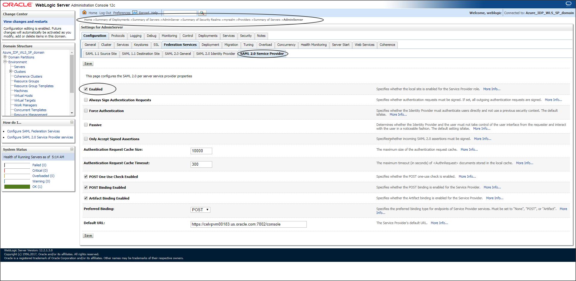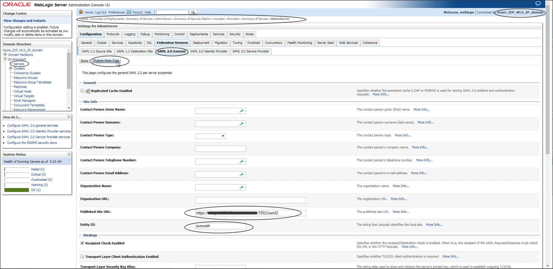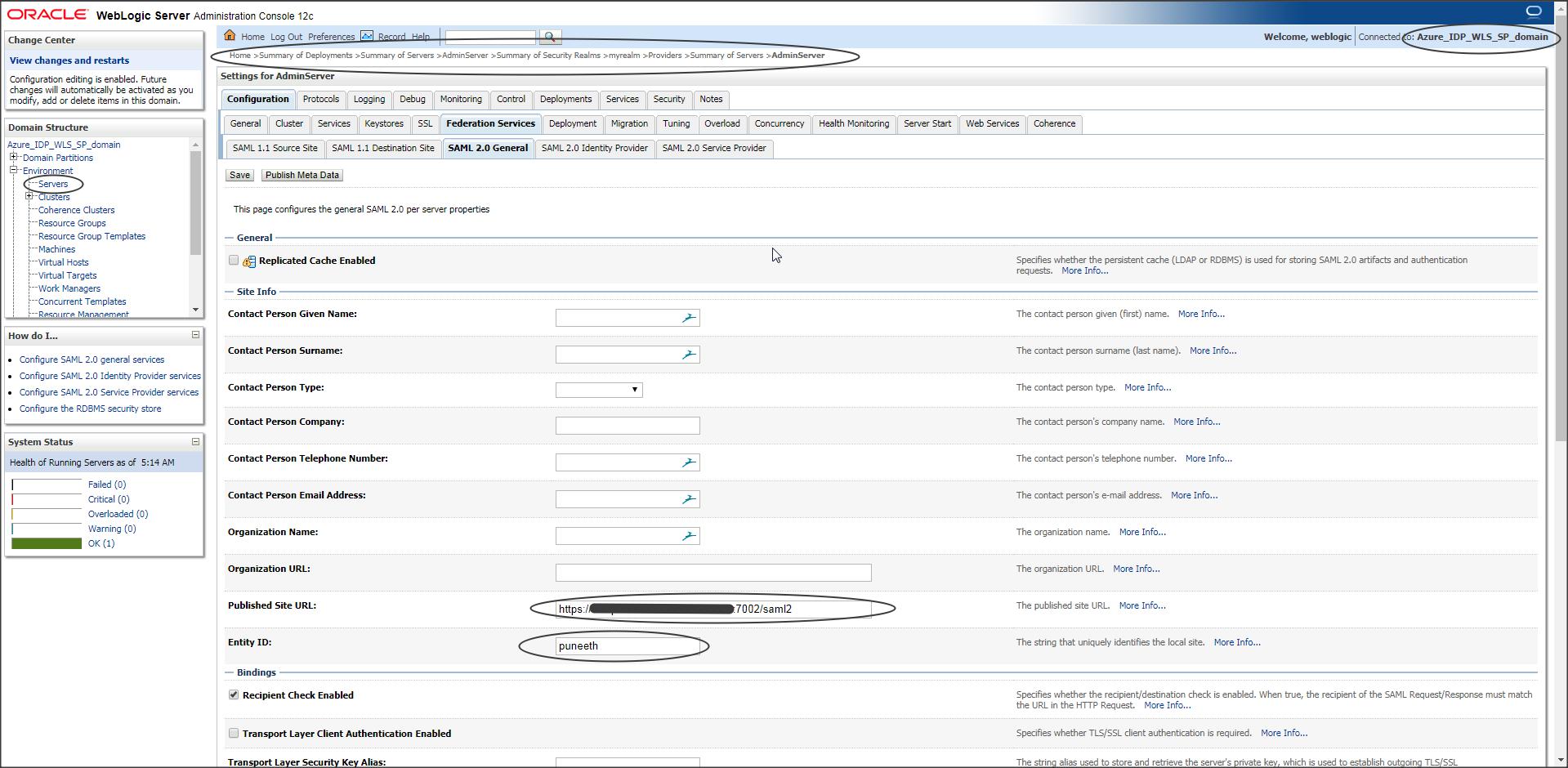 In this example I am configuring SSO for the WLS console application which is deployed to the Admin Server by default, hence I need to update the SAML2.0 General tab under AdminServer.