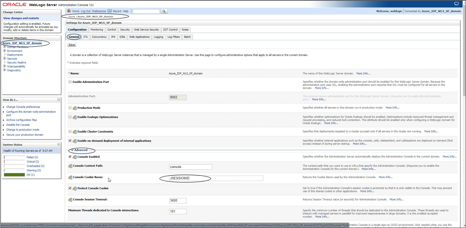 Since we are testing SSO using the console application, you need to change the cookie name for console application in Weblogic :