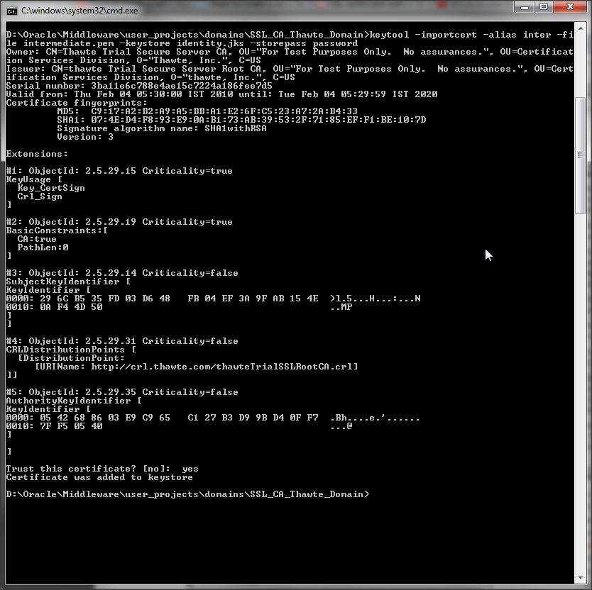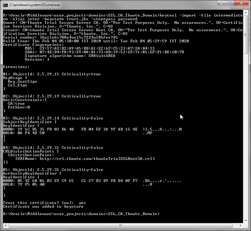 Command :  keytool -import -file intermediate.pem -alias inter -keystore trust.jks -storepass password