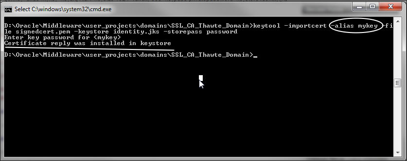 Command : keytool -importcert -alias mykey -file signedcert.pem -keystore identity.jks -storepass password