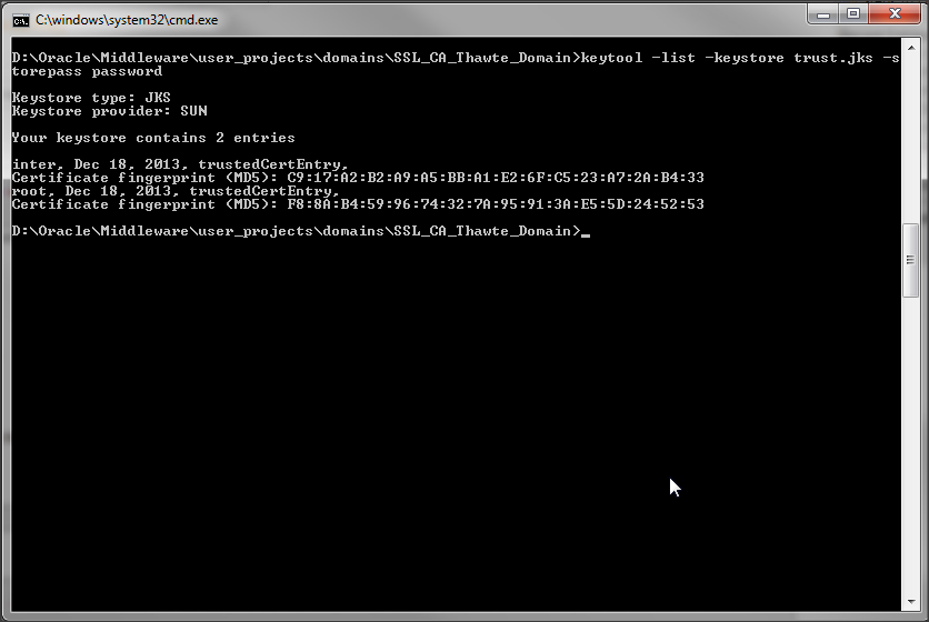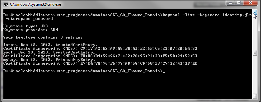Command : keytool -list -v -keystore identity.jks -storepass password