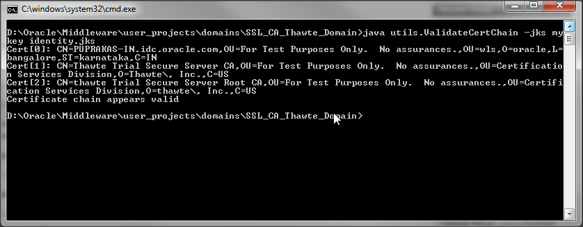 Syntax : java utils.ValidateCertChain -jks <alias> <identity_keystore>