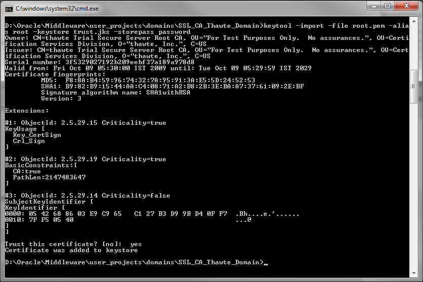 Command : keytool -importcert -alias root -file root.pem -keystore identity.jks -storepass password