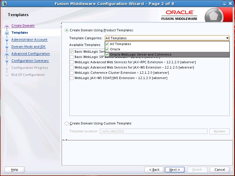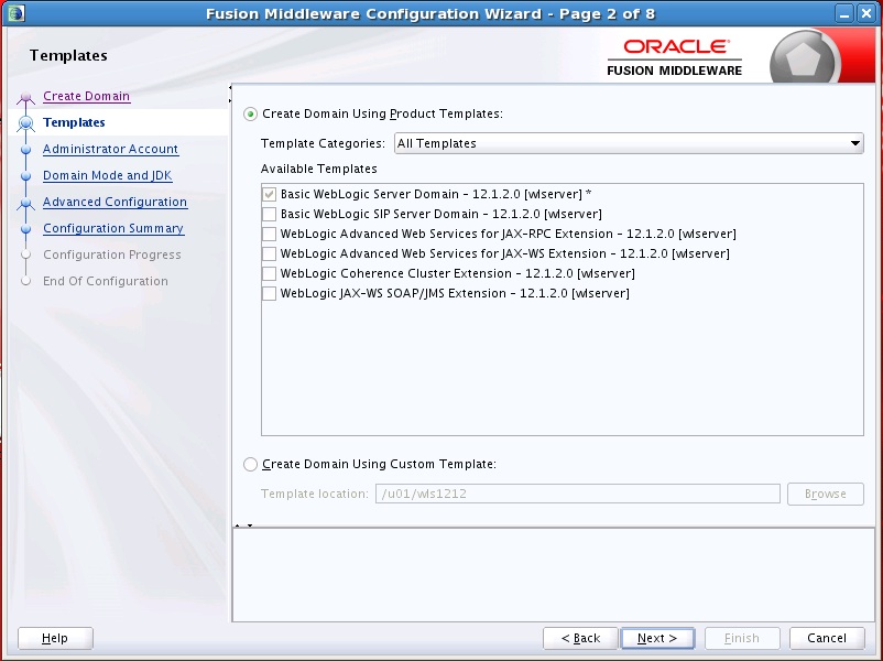 export CONFIG_JVM_ARGS="-DuserTemplates=/Oracle/Middleware/wlserver/common/ templates/wls/wls.jar,/Oracle/Middleware/wlserver/common/templates/ wls/wls_webservice_jaxws.jar"