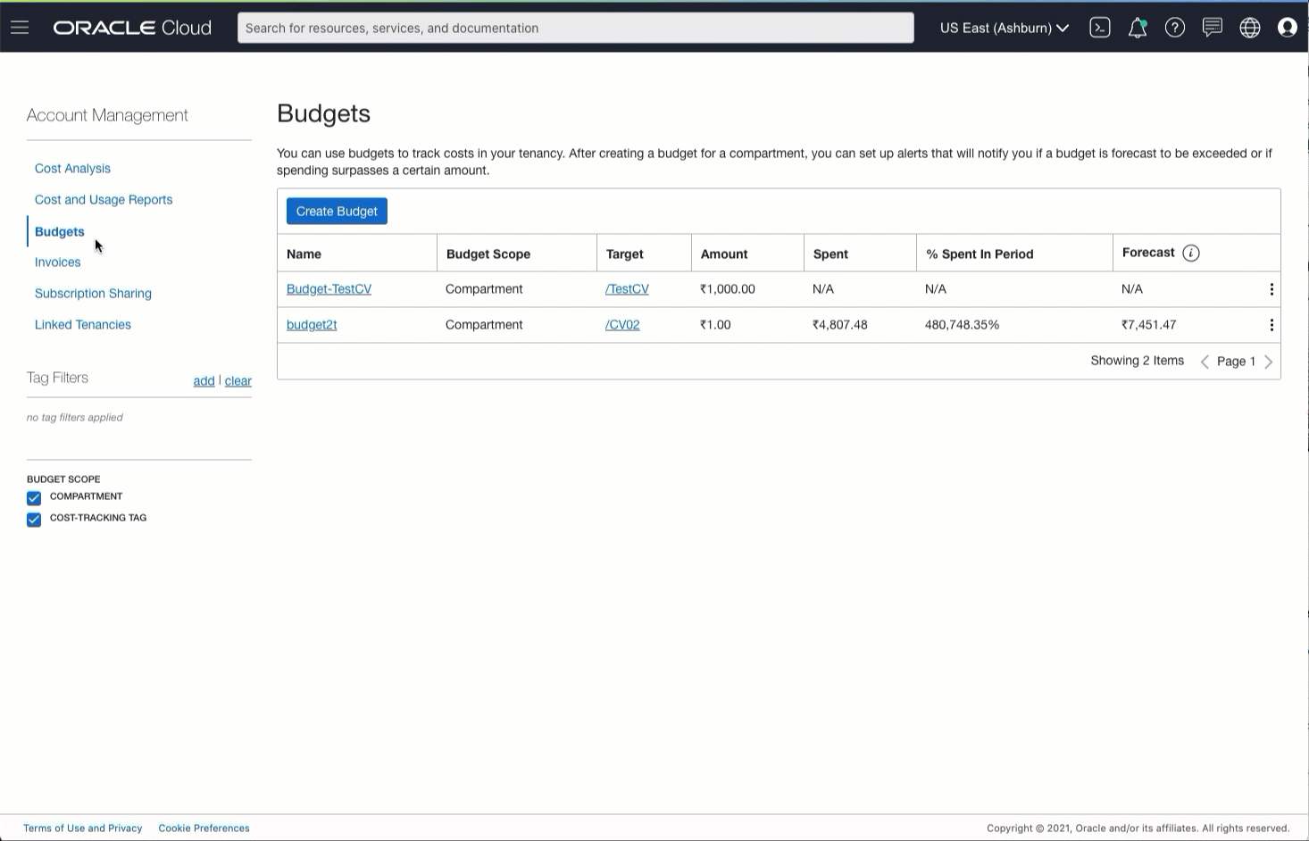 Furthermore, you can set a maximum budget and a budget alert for all resources using a specific tag, preventing accidental spending, as illustrated below.