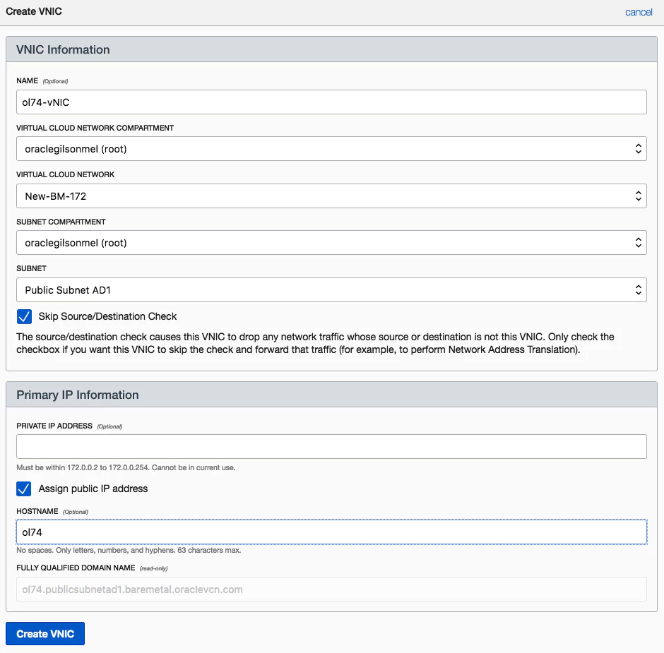 Before configuring the guest instance, the host interface needs additional configurations. Next step is creating a secondary vNIC and attaching it to the KVM Nested VM instance. This secondary vNIC will be used for the Nested VM guest. Using the OCI Dashboard, click on the details of the KVM Nested VM instance, select “Attached vNICs” and click on “Create vNIC” option. Below is an example using a Virtual Cloud Network (VCN) called “New-BM-172” on Availability Domain1 (AD1)