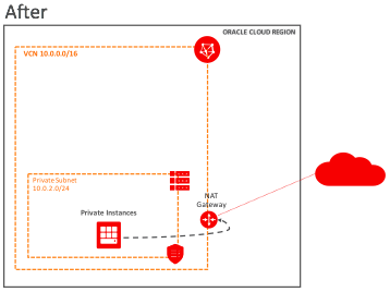In just a few steps, you can give all the instances in the private subnet access to resources on the internet. As with the other Oracle Cloud Infrastructure gateways (Service, Internet, and so on), the NAT gateway is highly available and scales elastically to meet your bandwidth requirements. You can now delete the public NAT instance, which is no longer required.