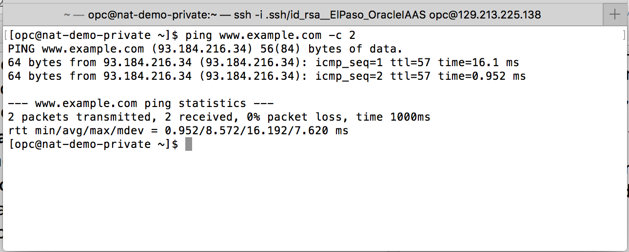 Through a bastion host (not shown), you used SSH to connect to the private instance and access resources on the public internet, as shown in the following example: