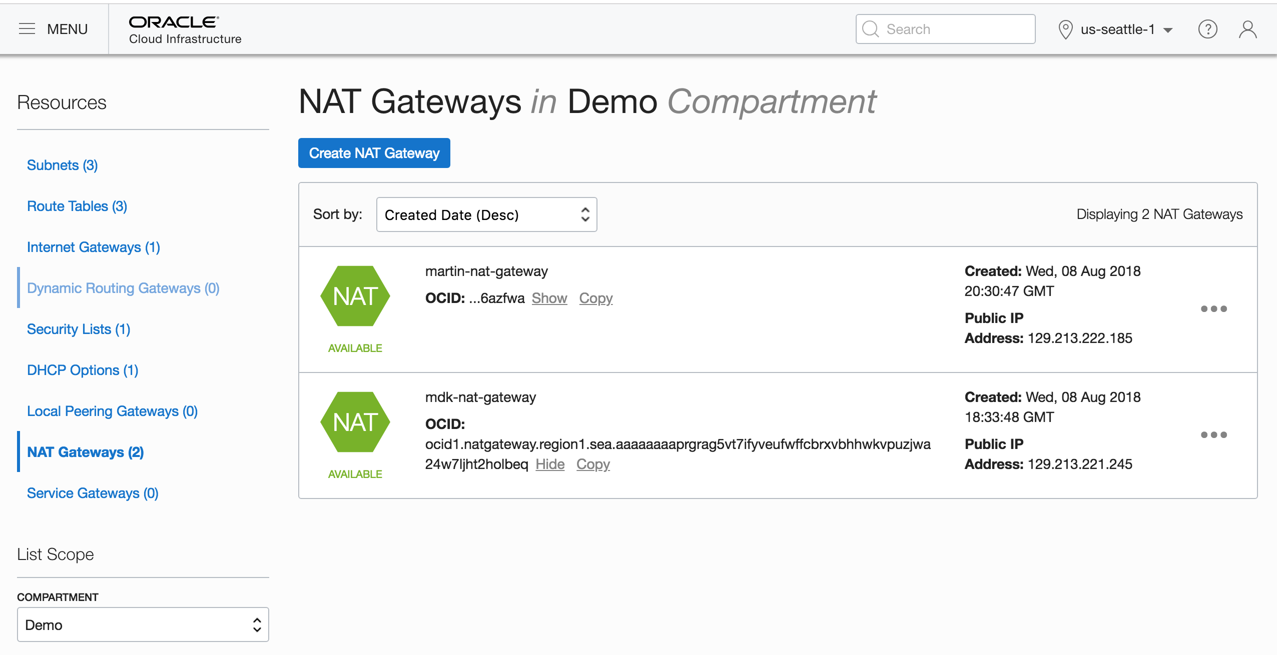 You can see the newly created gateway in the list of NAT gateways for the VCN: