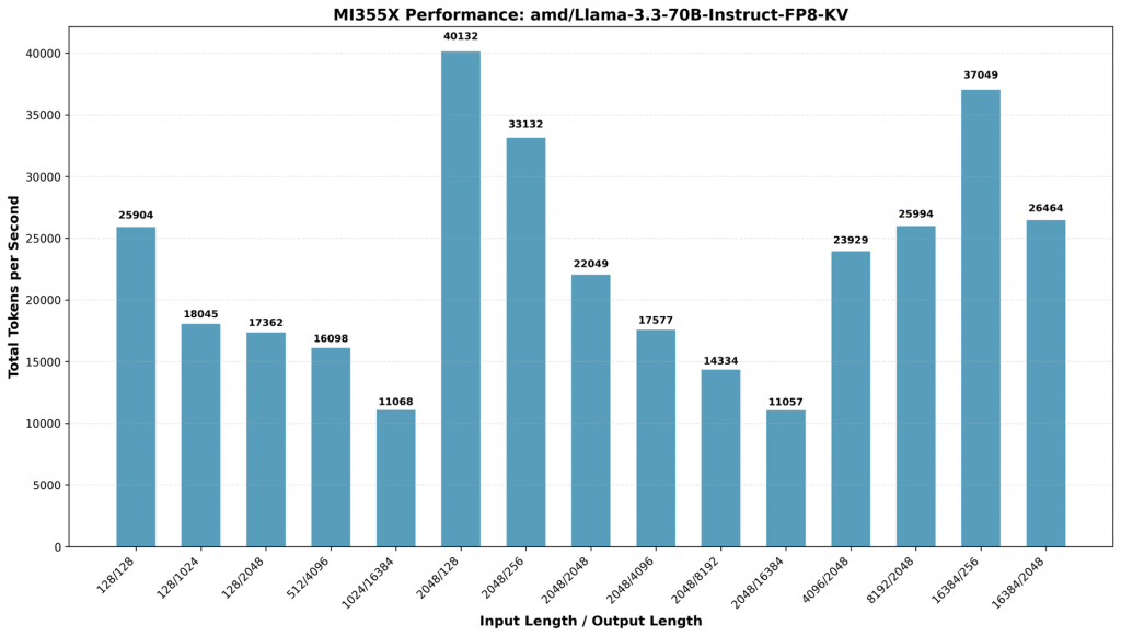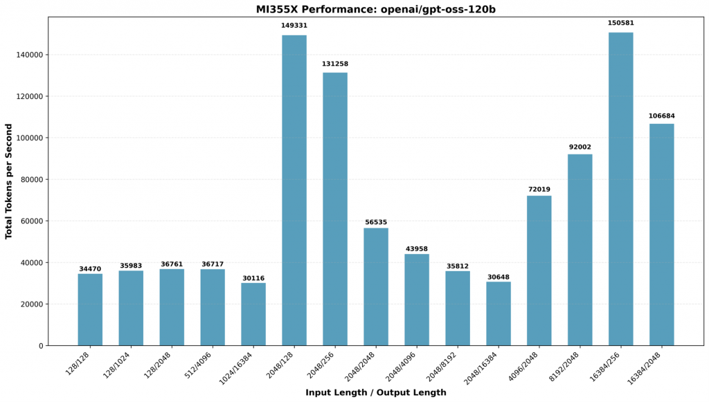The MI355X’s architecture and performance metrics position it as a versatile solution for AI inference workloads. The support for lower precision formats like FP8, FP6, and FP4 enables faster inference processing with reduced computational overhead, making the MI355X ideal for real-time AI applications. We ran different target AI inference workloads profiles from low input & output tokens to very large summarization use case and consistency saw liner scanning and amazing performance for large content lengths.