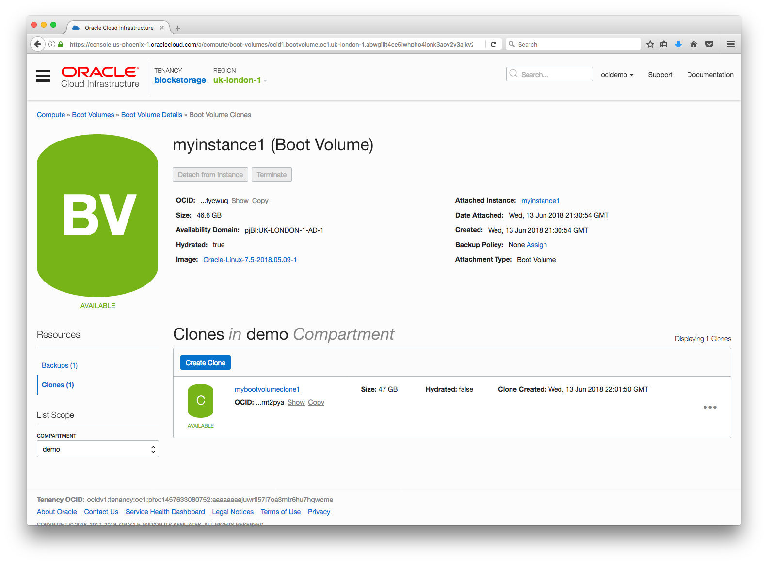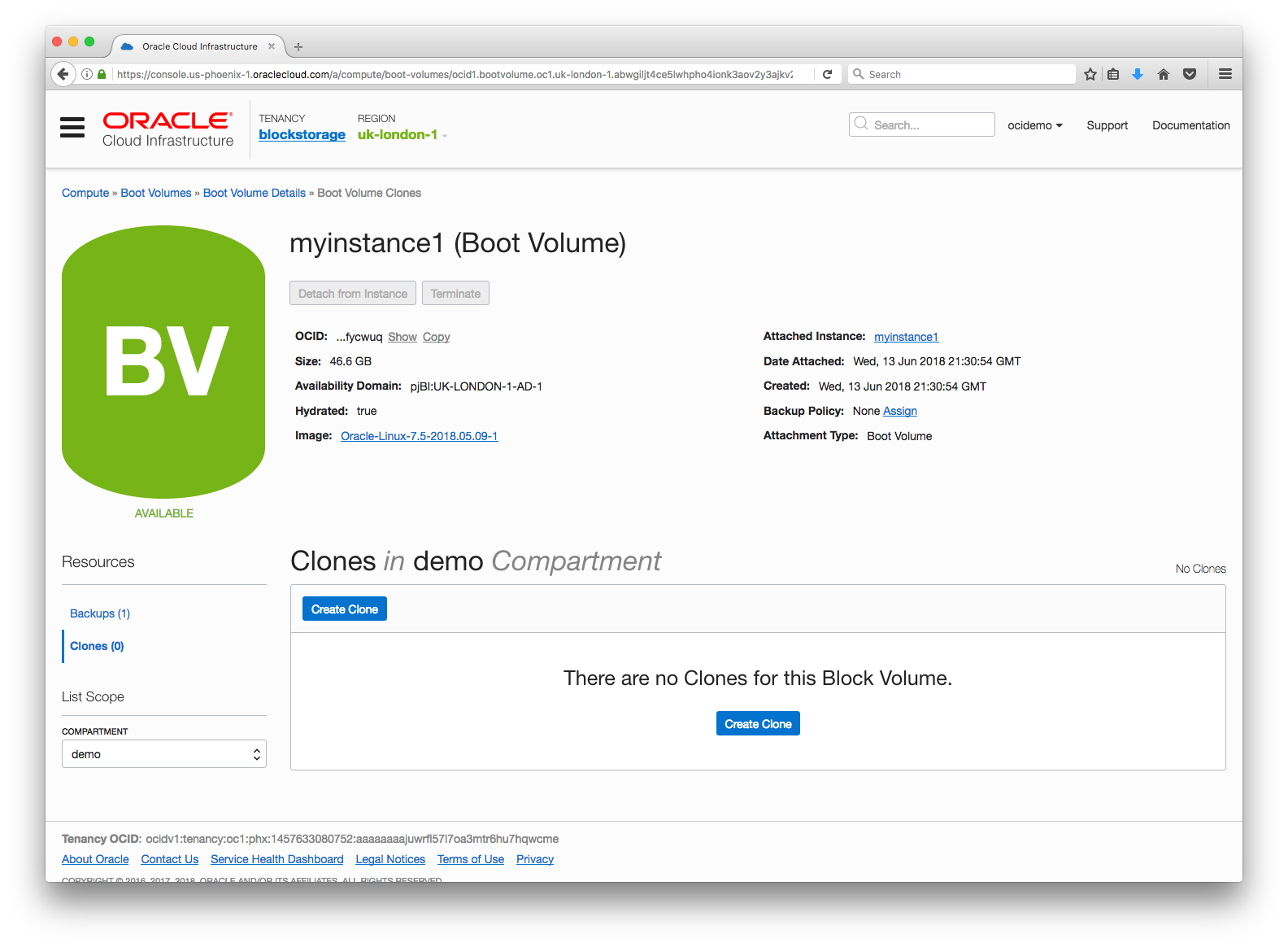 - On the Boot Volume details page, click Clones and then click Create Clone.