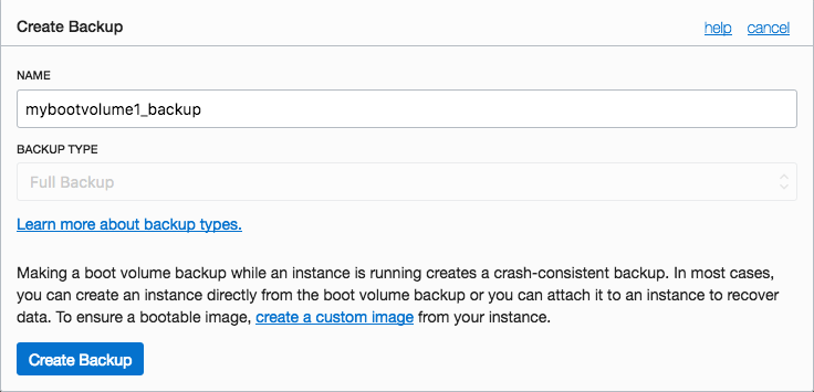 - On the Boot Volume details page, click Backups and then click Create Backup.