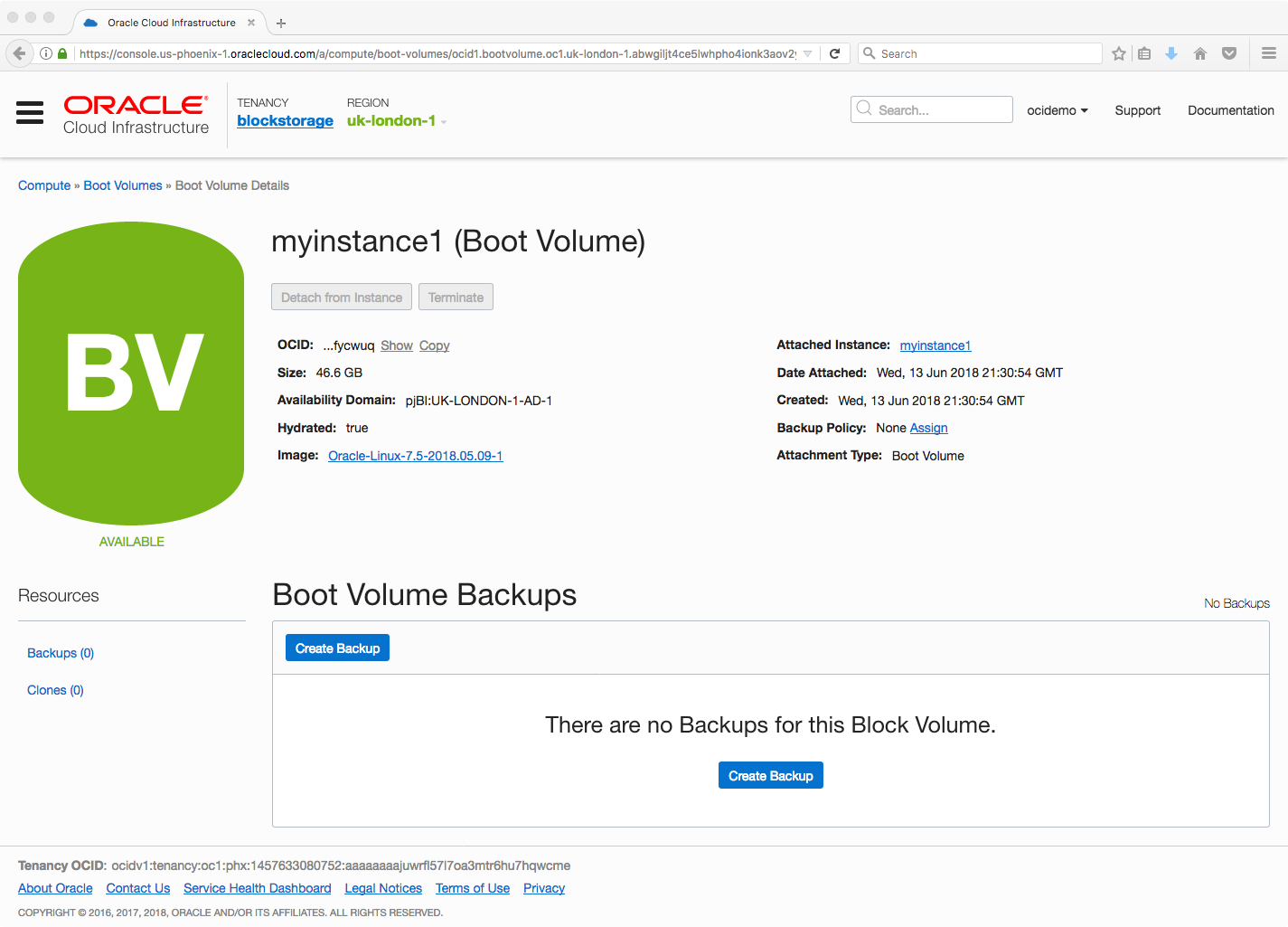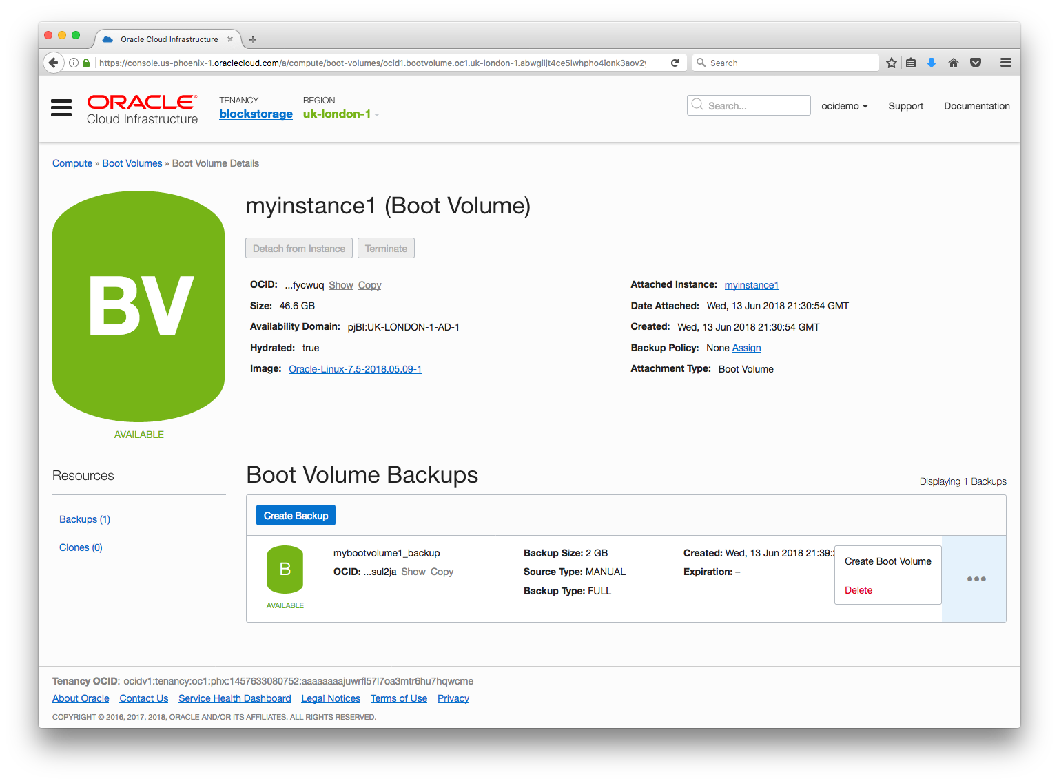The rest of this post walks through creating a boot volume backup and clone in the Console.