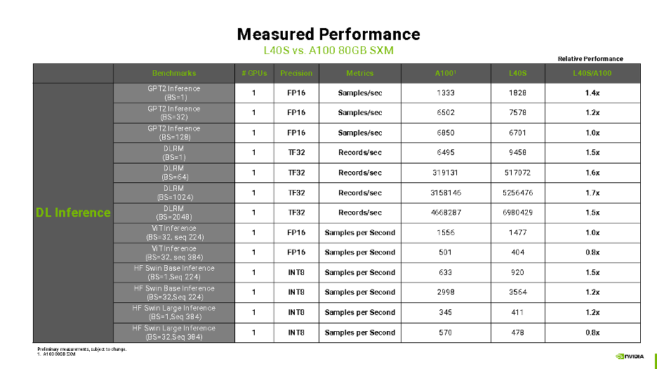 The NVIDIA L40S is the highest-performing universal GPU, with 1.2-2x improved price performance, up to 1.2x more generative AI inference performance, and up to 1.7x better training performance compared to the NVIDIA A100 Tensor Core GPU.