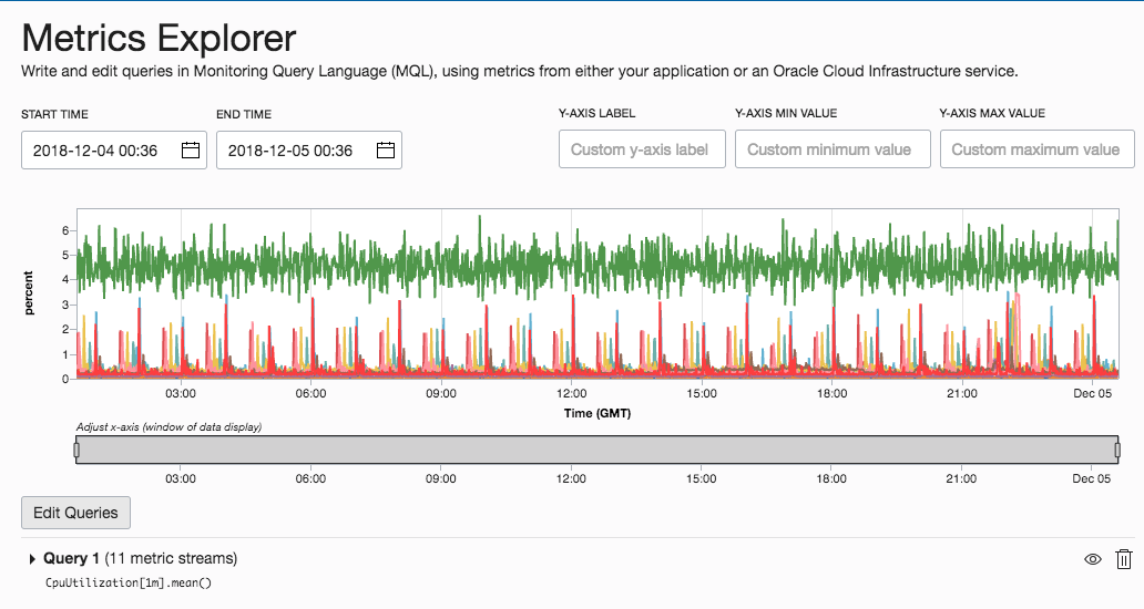 Use the Metrics Explorer to understand the health of your Oracle Cloud Infrastructure Resources. Metrics can be visualized individually or aggregated across multiple resources. Below is the CPU percentage for multiple Compute Instances over the past day: