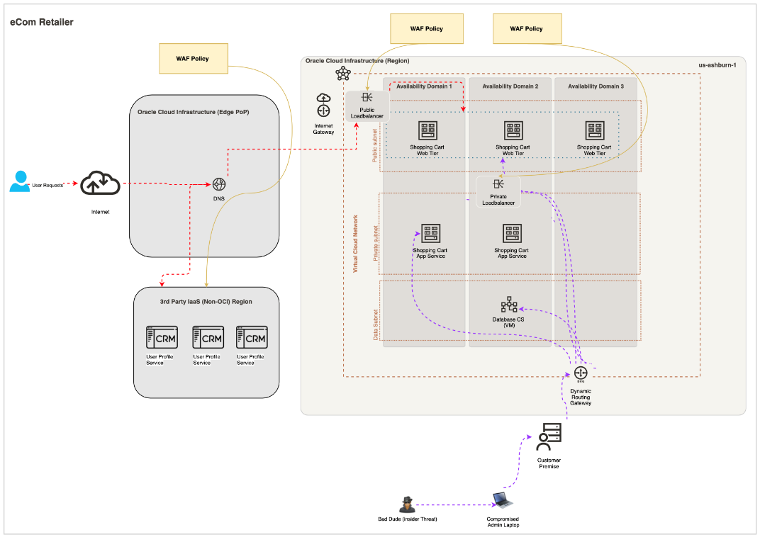 Just as legitimate users interact with the e-commerce site, hackers can conduct malicious interactions pretending to be legitimate users as well. These attacks predominantly occur as layer 7 DoS/DDoS attacks, SQL injections, cross-site scripting and malicious file executions. These requests are filtered using WAF rules and threat intelligence feeds to help ensure only good traffic is allowed. WAF accomplishes this by intercepting and analyzing each and every HTTP request against the set of WAF policy security rules. These rules protect against OWASP Top 10 vulnerabilities, rate-limit or block layer-7 DDoS attacks like HTTP flood, SYN flood. Additionally, WAF policy at the edge can also secure internet-facing workloads hosted outside Oracle Cloud Infrastructure such as the CRM service, in this example.