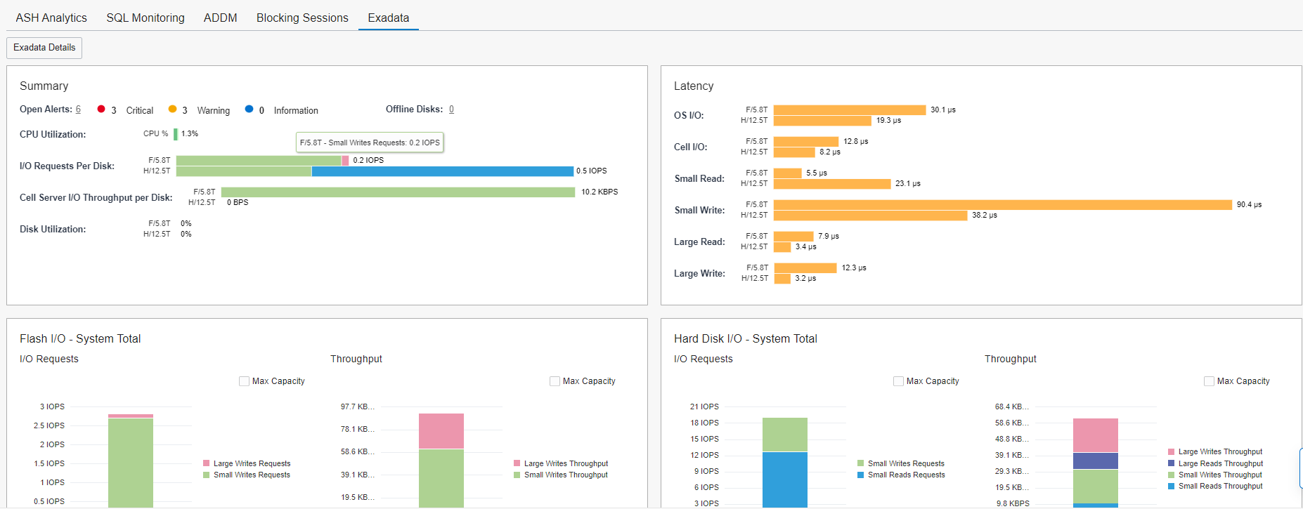 Performance Hub now has a new tab for Exadata. This tab provides a unified view of Oracle Exadata hard disk and flash performance statistics with deep insight into the health and performance of all components, such as the Oracle databases, Oracle Exadata storage cells, and Automatic Storage Management (ASM). You can use the Exadata tab for enhanced performance diagnostics for databases deployed on Exadata systems.