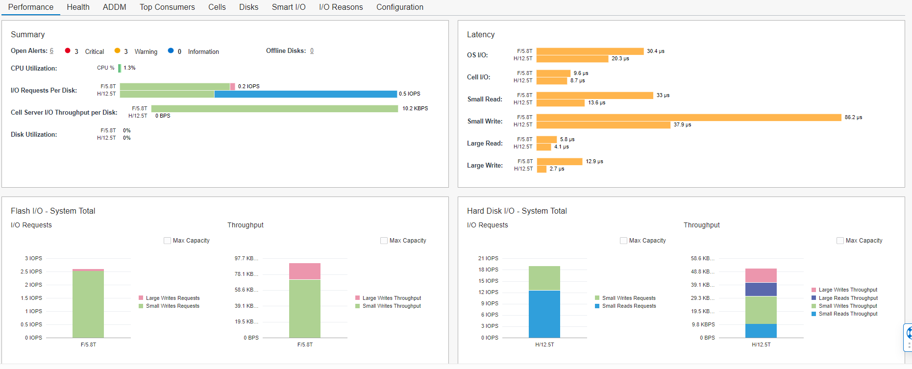 The performance section of the Exadata tab Performance shows database performance, including a summary, latency statistics, flash I/O statistics, and Hard Disk I/O statistics. This section provides the following features: