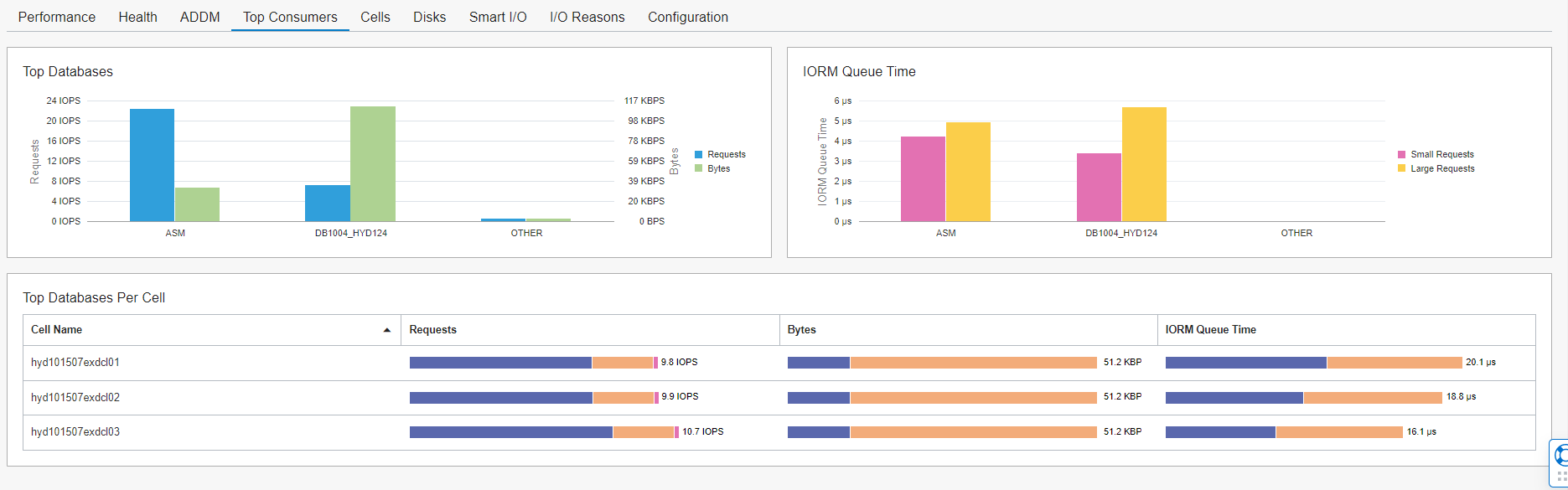 The Top Consumers section in the Exadata tab provides detailed data for analysis of capacity usage for Oracle databases and the systems that host Oracle databases. You can identify workload distribution across all the databases and databases consuming a significant amount of the I/O bandwidth. It also displays the IORM queue time, the details of the top databases per cell, and the details of the IORM queue time.